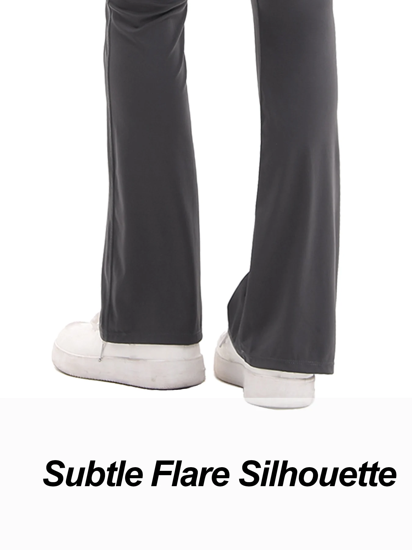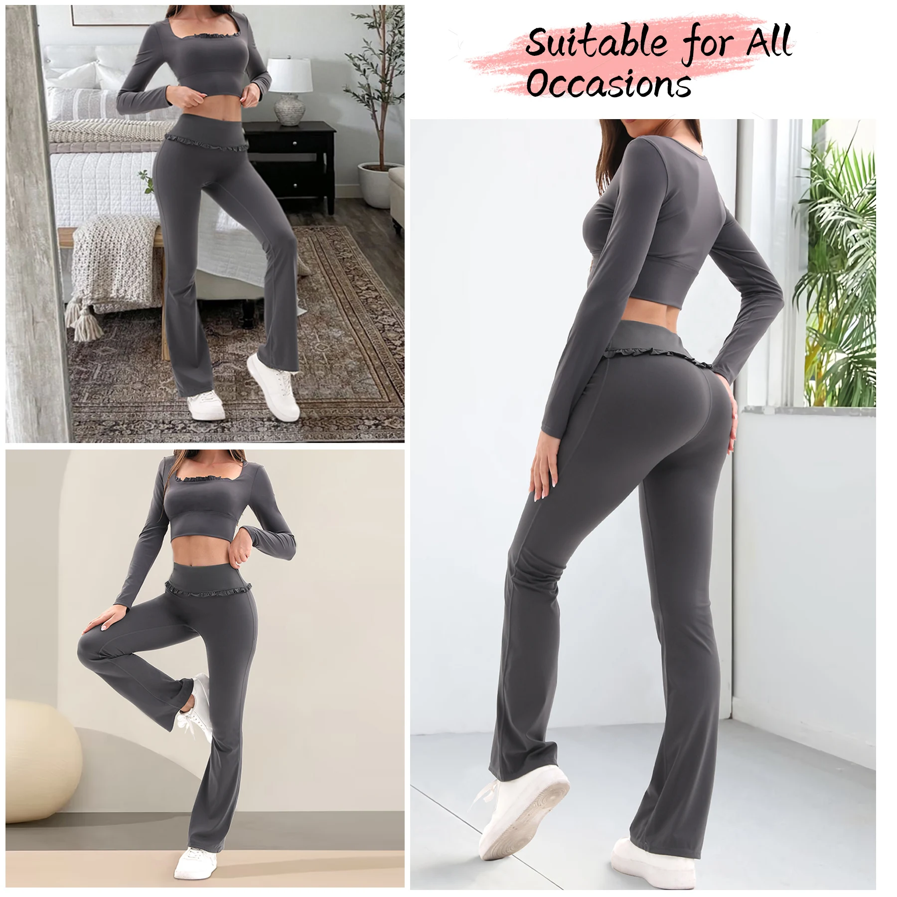 Conjunto de Yoga de 2 Piezas con Volantes para Mujer, Cintura Alta, Control de Abdomen, Pantalones Acampanados, Top de Manga Larga, Ropa Deportiva para Gimnasio, Correr, Clásico, Gris Oscuro
