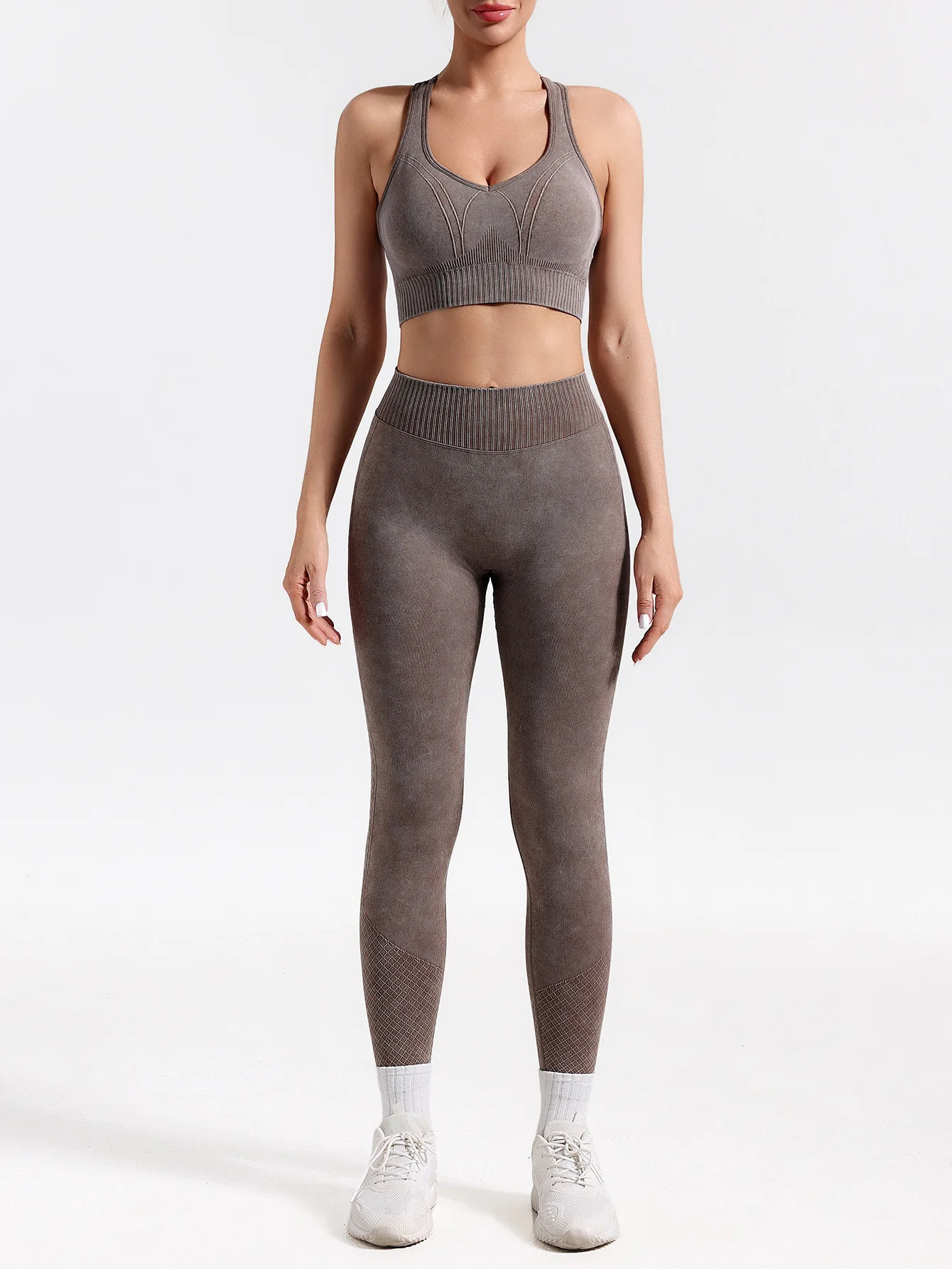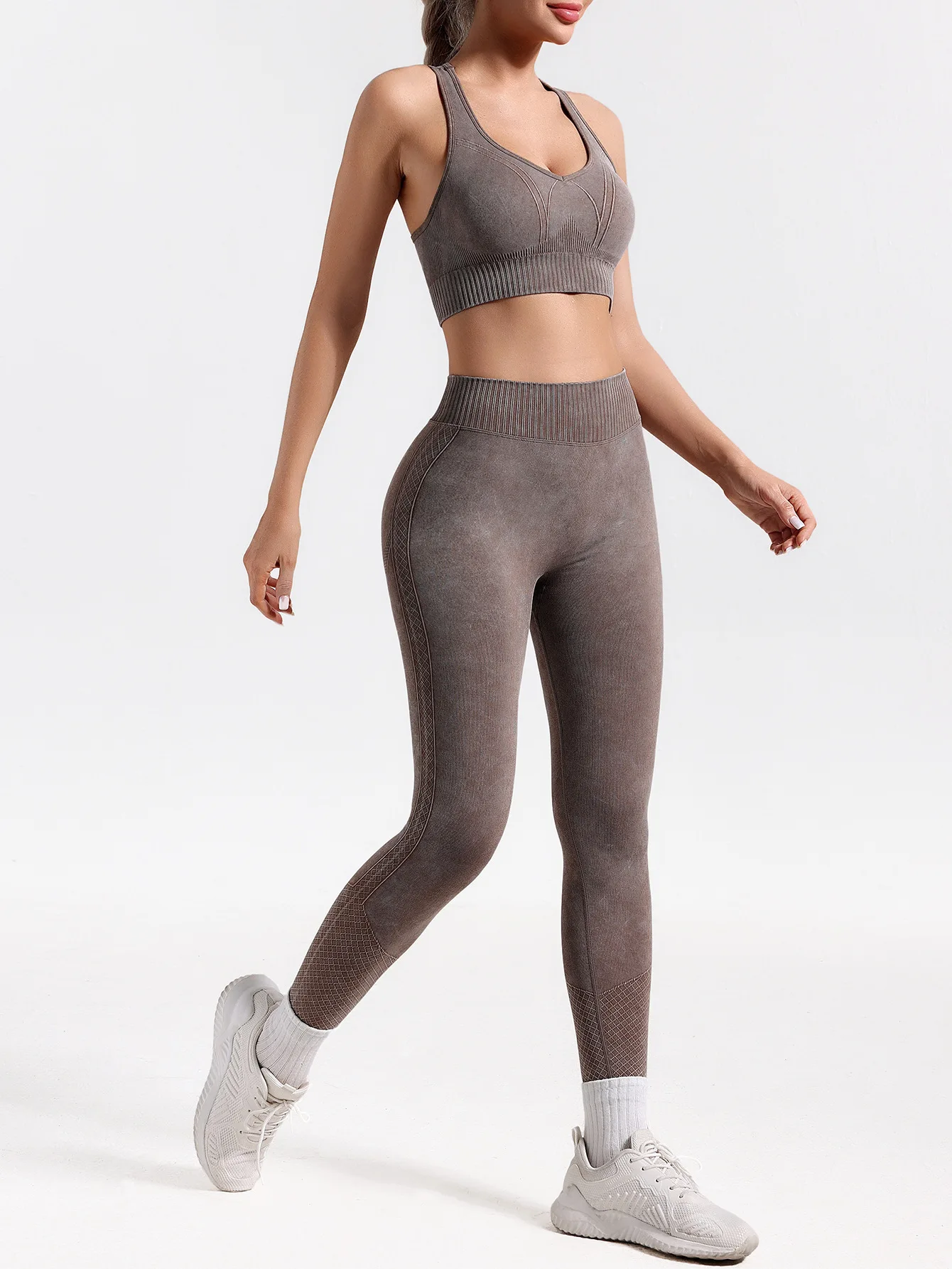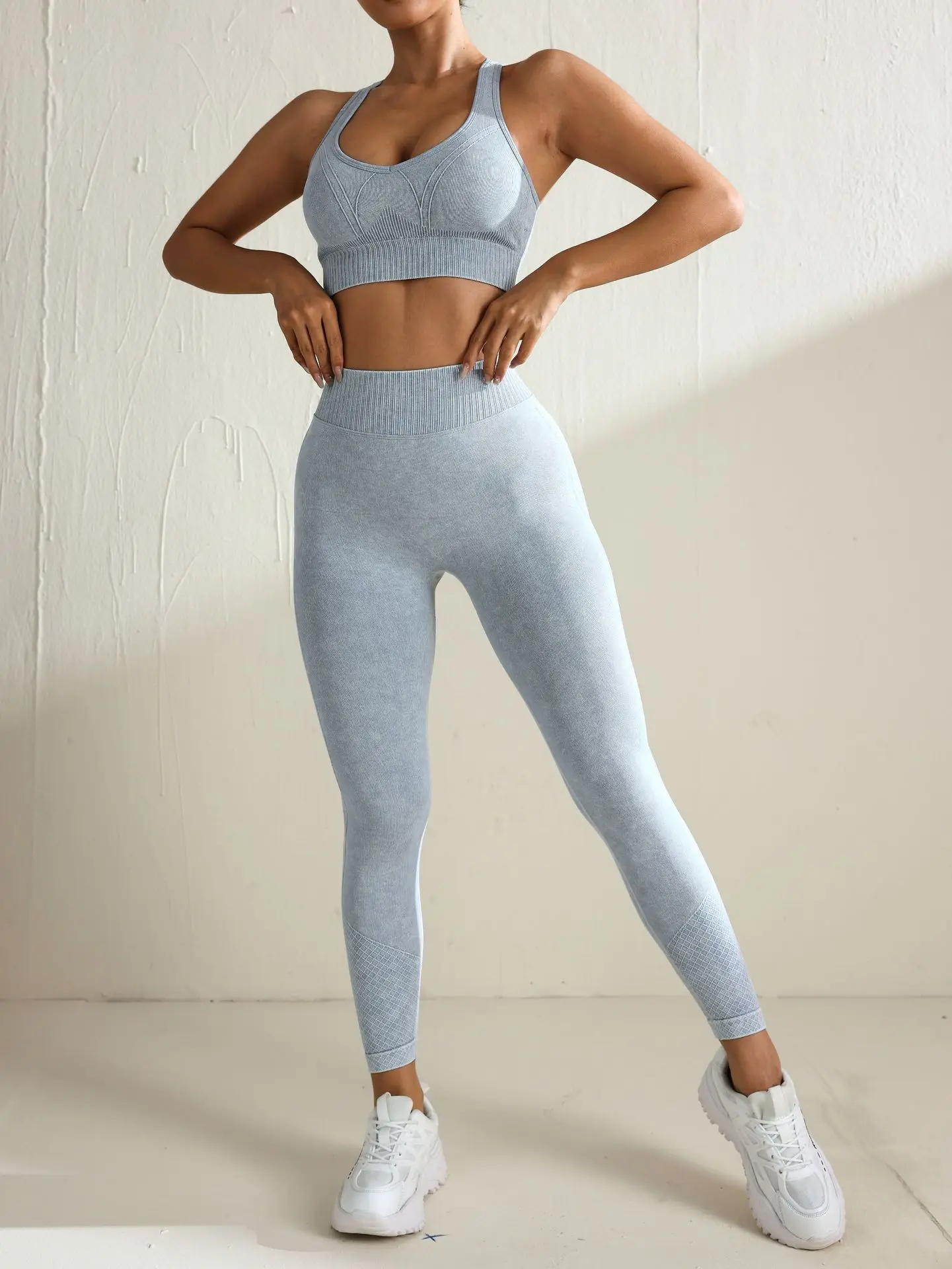 Conjunto de yoga sin costuras con lavado ácido de 2 piezas para mujer, ropa deportiva para gimnasio, leggings, conjunto deportivo para entrenamiento, espalda en V, traje de fitness Teveo para mujer