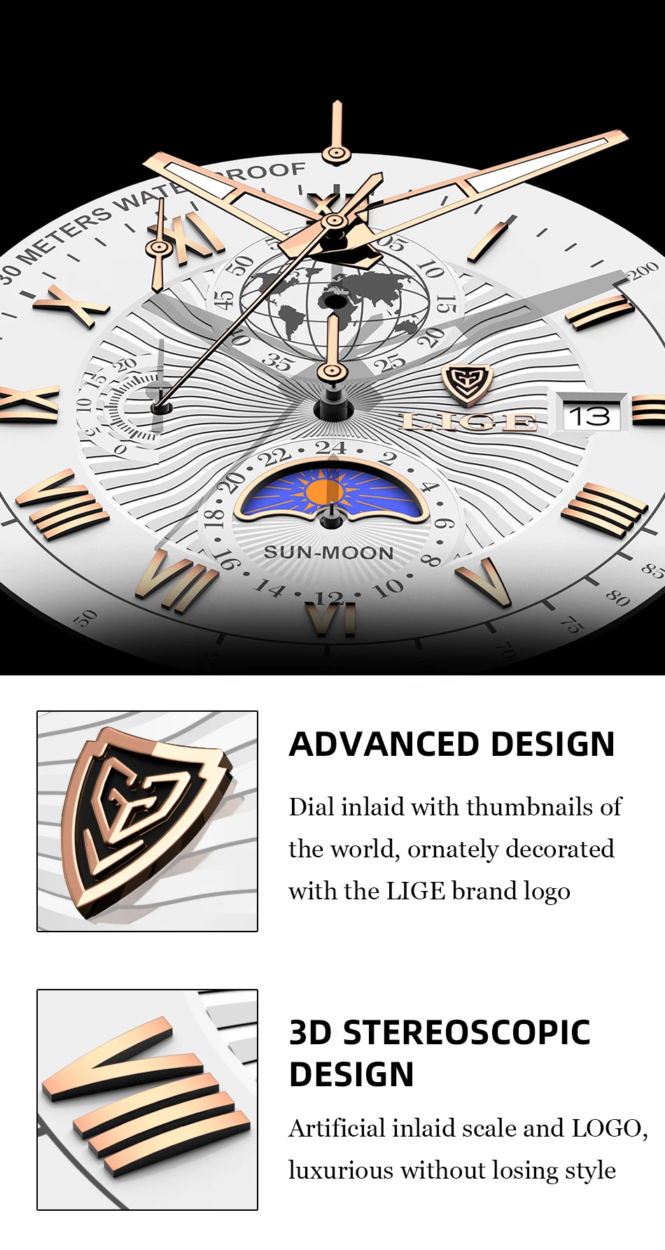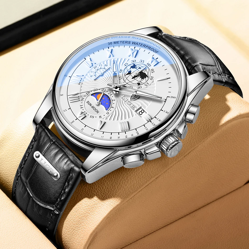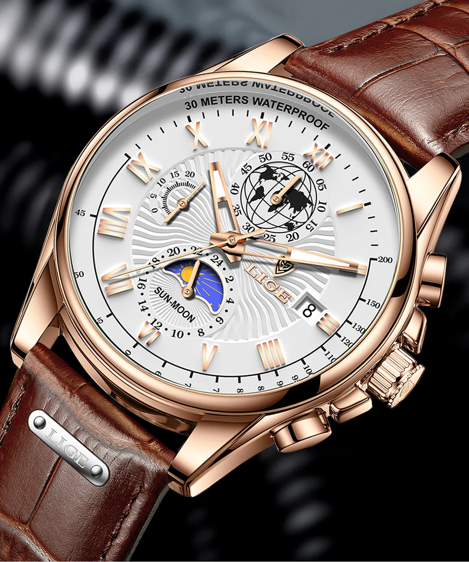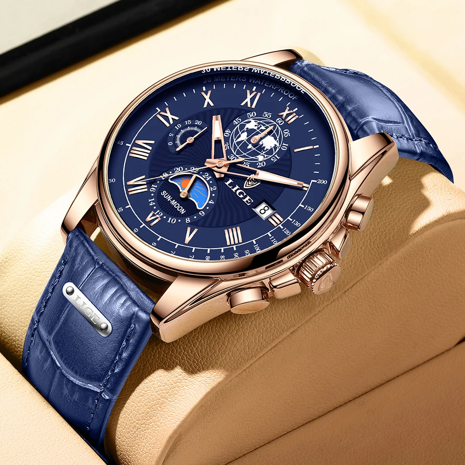 LIGE 2024 - Nuevo reloj de cuero azul para hombre, marca de lujo, resistente al agua, deportivo, con fecha, de cuarzo, Masculino