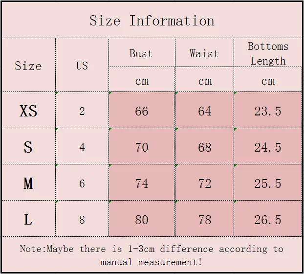 XS TopLength: 3.54 Bust: 25.98 Waist: 25.2 Pant Length: 9.25