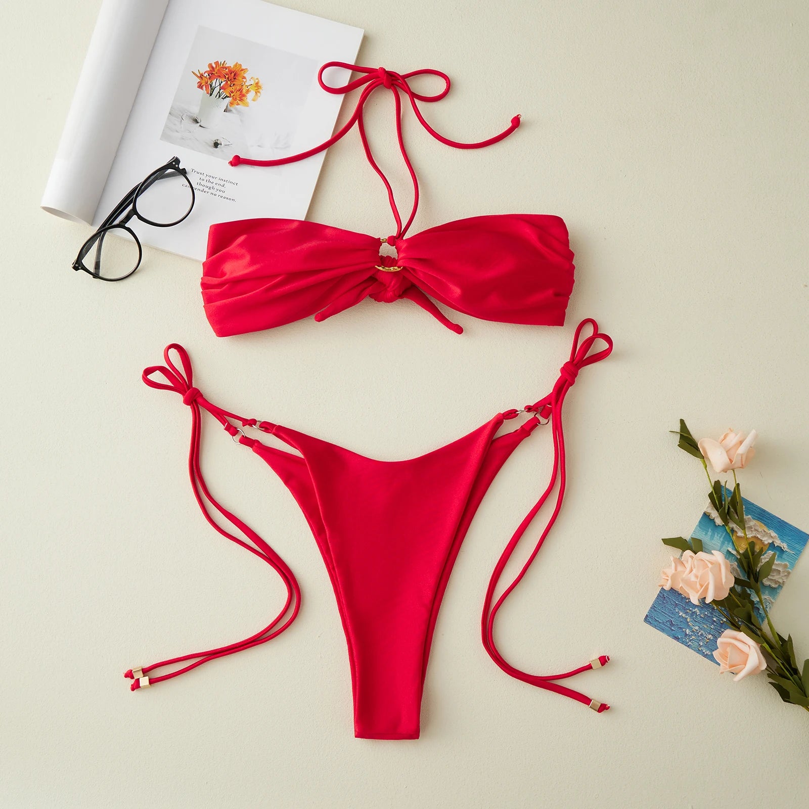 2025 Women's Patchwork Summer Bikini Set Solid Color Metal Ring Strapless Bra with Tie-up Low Waist Shorts 2 Pcs Swimsuit