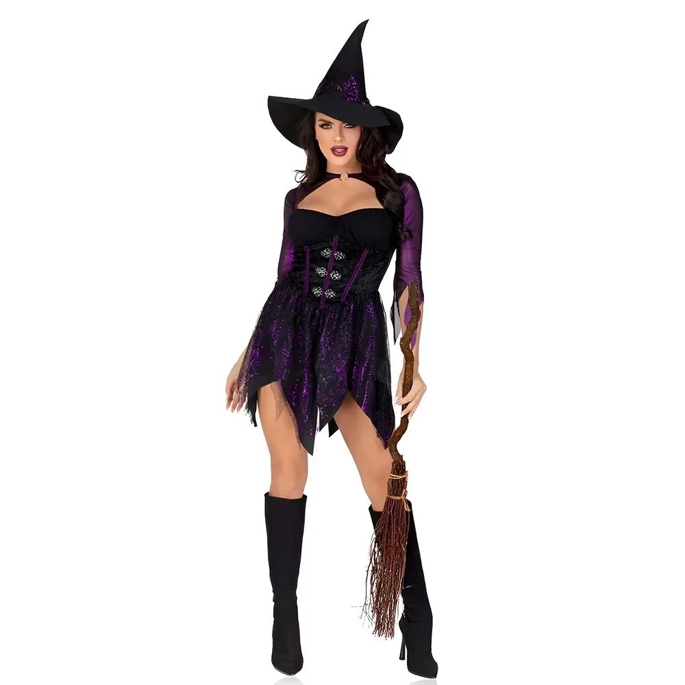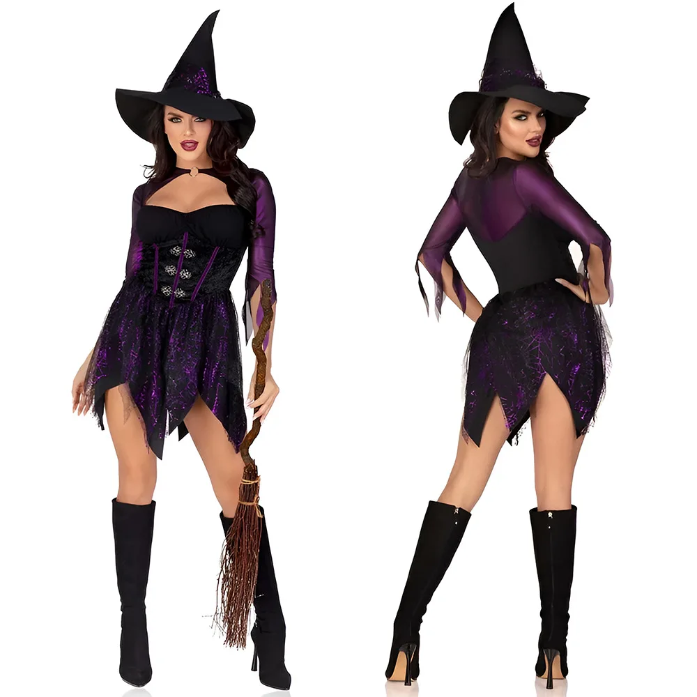 3 Piece 2025 Sexy Underwear Women Witch Long Sleeves Short Purple Triangle Lace Dress With High Hat Role Playing Cosplay Costume