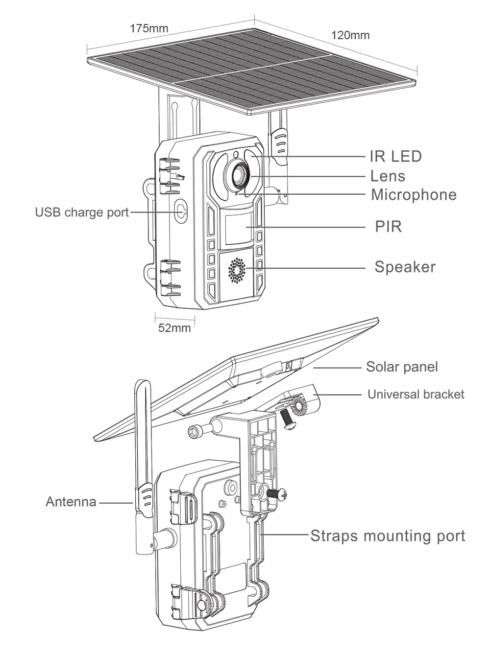 Lente de 10,36 mm, luz infrarroja integrada (850 nm), visión nocturna con alcance de 15 metros.