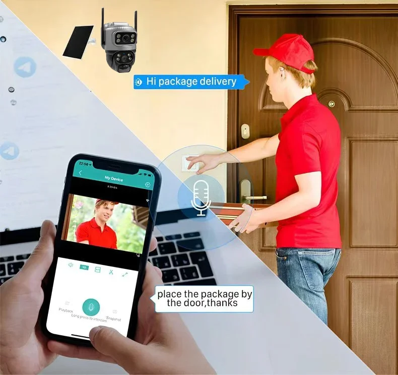 6. Intercomunicador de voz: Con la función de intercomunicador de voz, el sonido se puede transmitir al entorno exterior a través de teléfonos móviles o reproducir para los visitantes a través de dispositivos.