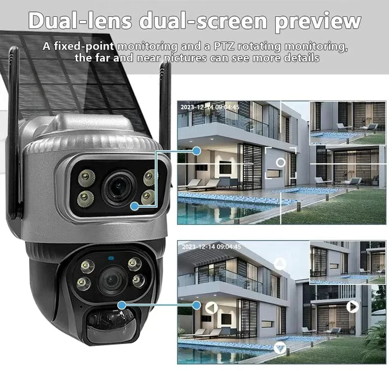 Cámara solar 4G de 8MP con lente dual 4K, PIR, tarjeta SIM integrada, visión nocturna, resistente al agua, cámara IP de seguridad con batería y monitor CCTV.