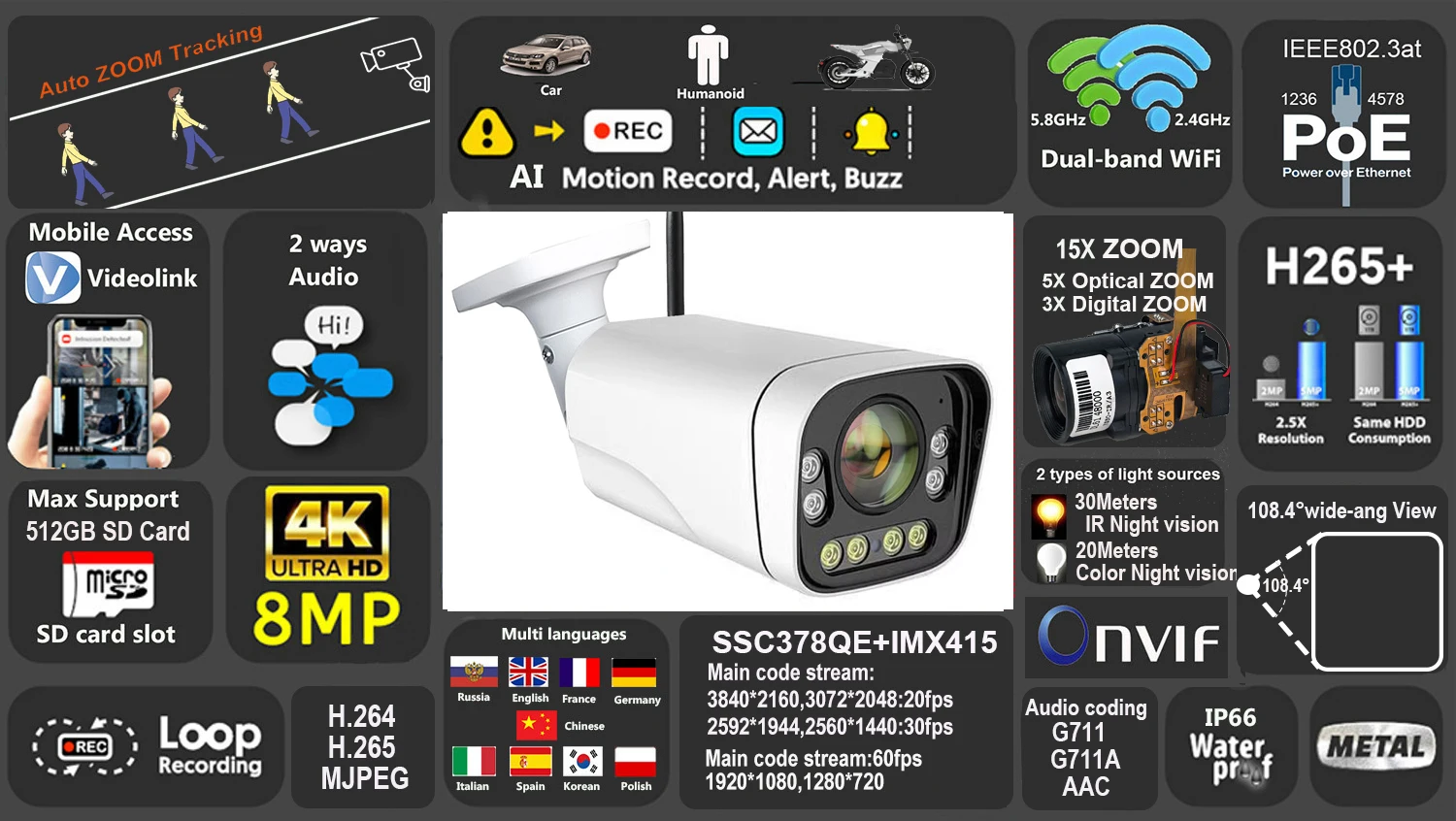 2:4K 20fps PoE+WiFi:SSC378QE+IMX415, 4K 8MP 20fps Zoom 15X +Seguimiento+PoE+WiFi