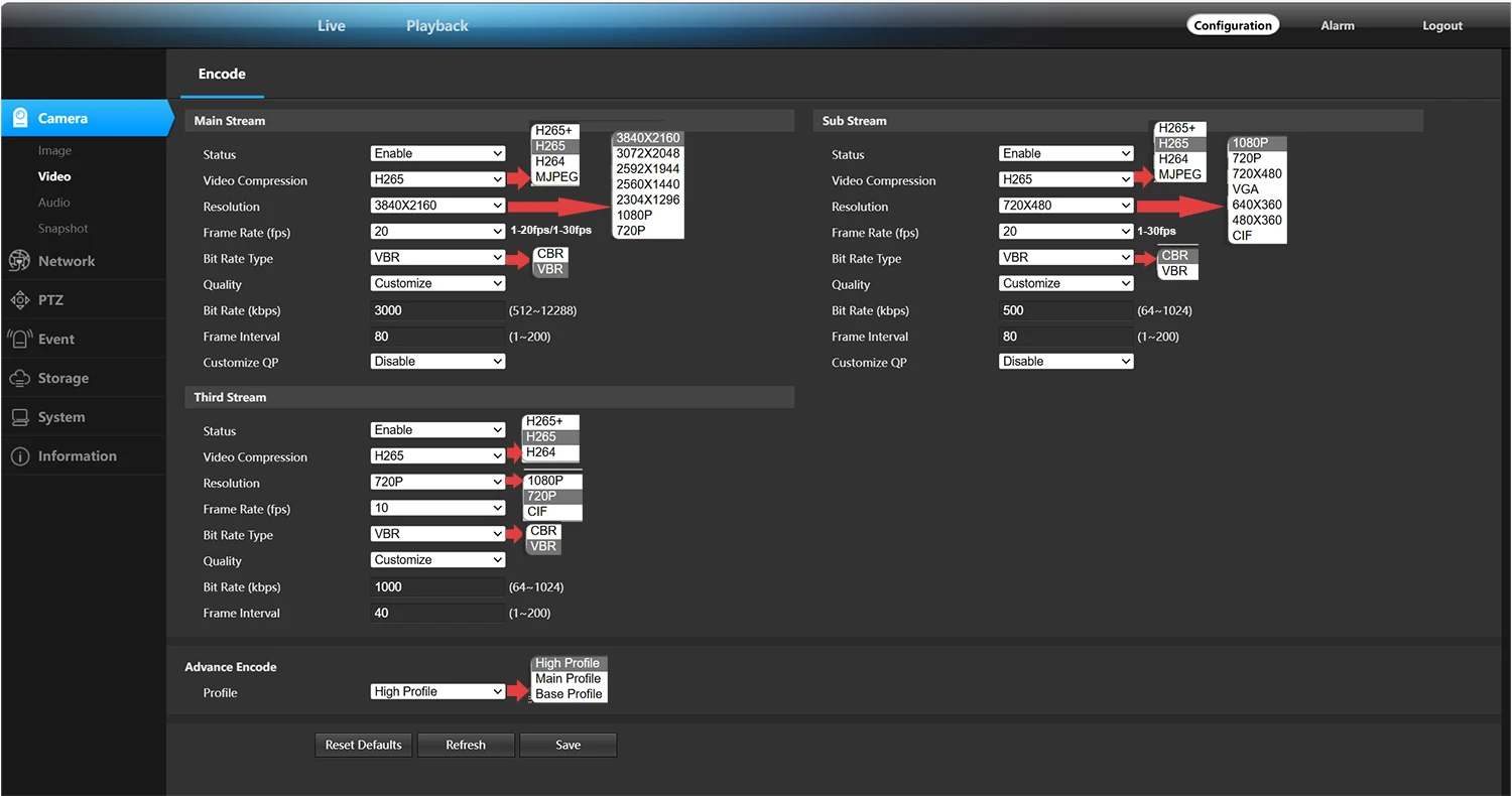 Admite 3 flujos de vídeo; el tercer flujo admite 1080p.