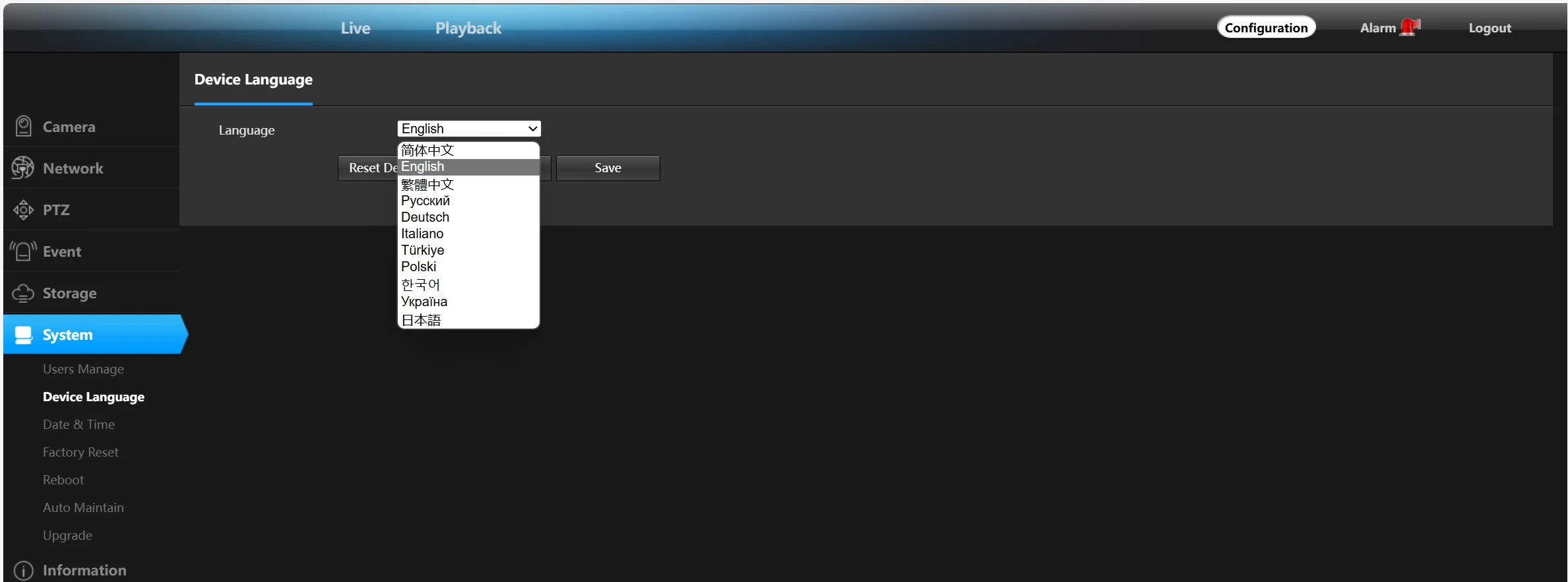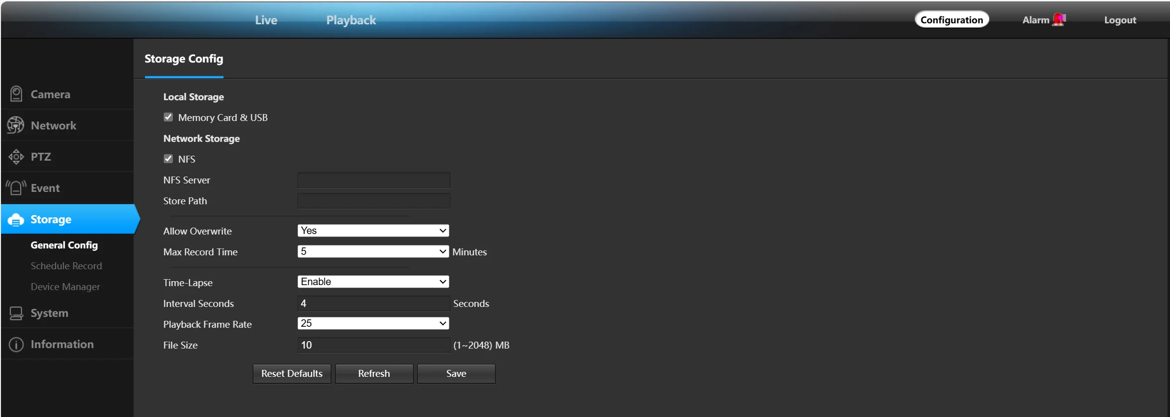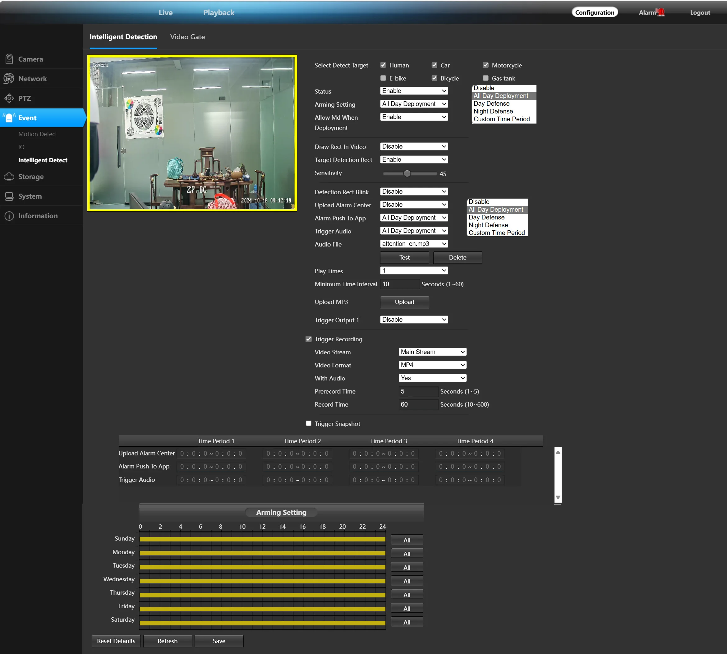 Admite alarma con IA, alarma con grabación de vídeo y alarma mediante aplicación móvil. Permite personalizar el tiempo de grabación de la alarma (de 20 segundos a 10 minutos). |