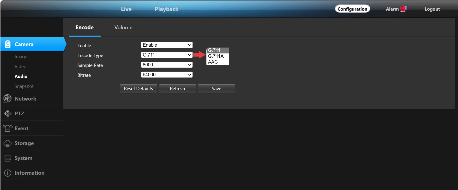 G.711, G711A, Frecuencia de muestreo: 8000-16000 Hz , Tasa de bits: 64000 kbps , AAC, Frecuencia de muestreo: 16000 Hz, Tasa de bits: 16000 kbps |