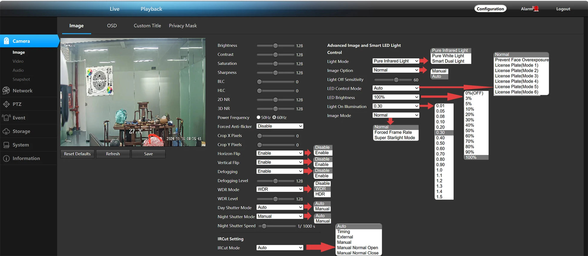 Admite brillo, contraste, saturación, nitidez, BLC, HLC, reducción de ruido 2D, reducción de ruido 3D, frecuencia de alimentación, antiparpadeo forzado, inversión de horizontal, inversión de vertical, desempañador, modo de obturador diurno y modo de obturador nocturno. |