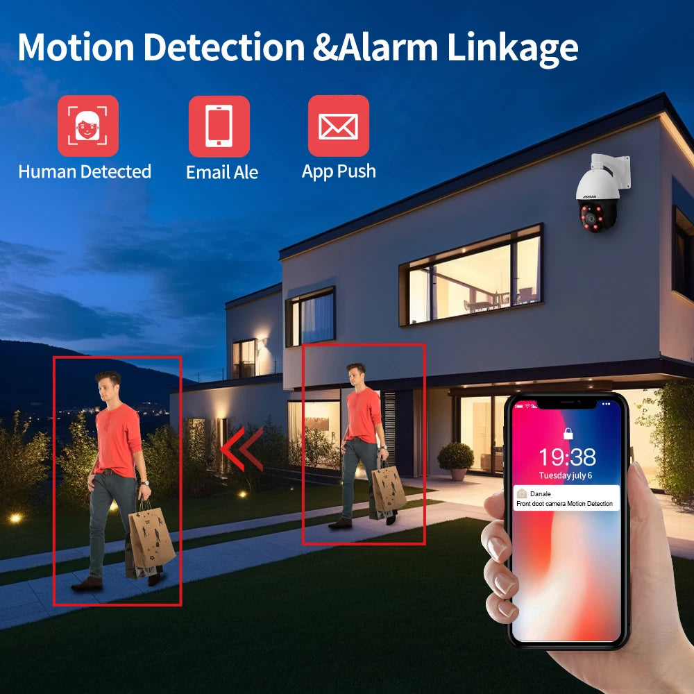 La cámara ajustará automáticamente la rotación panorámica/inclinación y el zoom, capturando objetivos de vigilancia nítidos y realizando un seguimiento automático de personas en movimiento, y enviará alertas por correo electrónico o notificaciones a su teléfono.