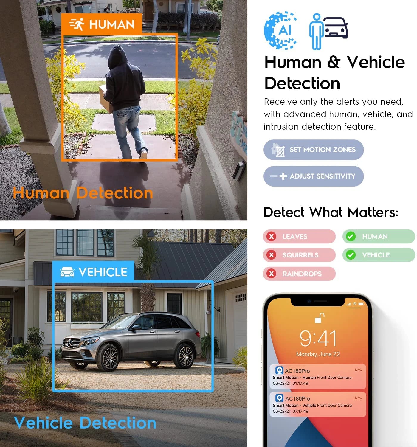Al analizar las siluetas de personas y vehículos a bordo, la cámara ASECAM puede distinguirlos de otros objetos. Le brinda tranquilidad al ofrecer una detección precisa y reducir considerablemente las falsas alarmas provocadas por movimientos insignificantes.
