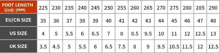 feet length 23.5cm, we will suggest size37; feet length 24cm, we will suggest size38; feet length 24.5cm, we will suggest size39; feet length 25cm, we will suggest size40; feet length 25.5cm, we will suggest size41; feet length 26cm, we will suggest size42; feet length 26.5cm, we will suggest size43. feet length 27cm, we will suggest size44. feet length 27.5cm, we will suggest size45. feet length 28cm, we will suggest size46. feet length 28.5cm, we will suggest size47. | |