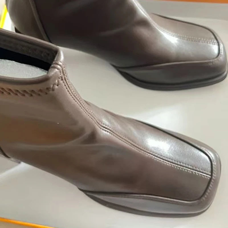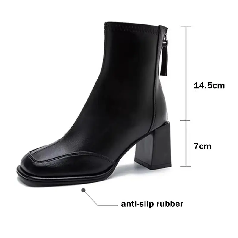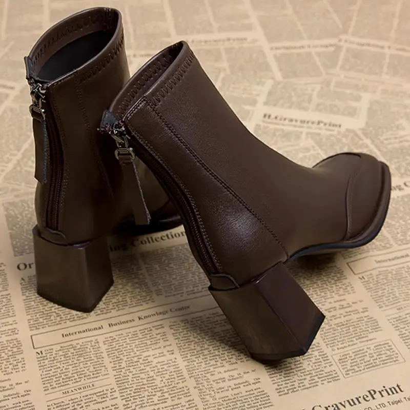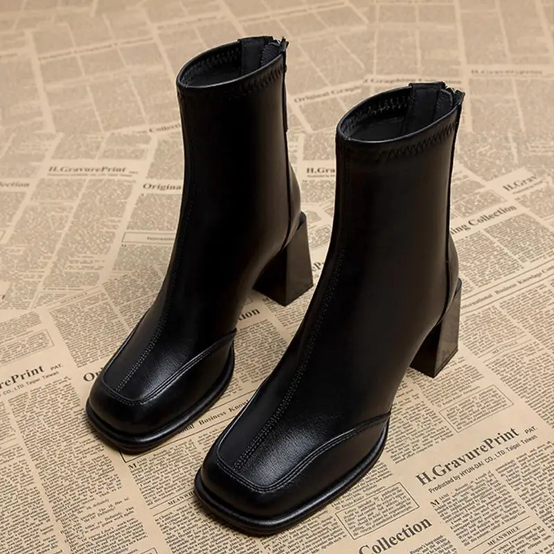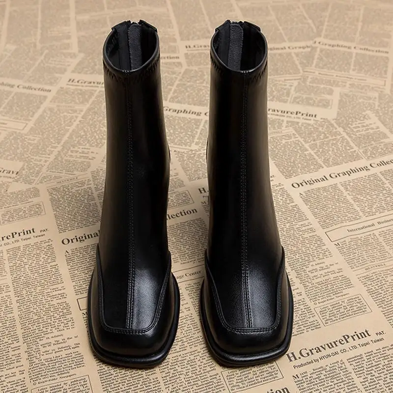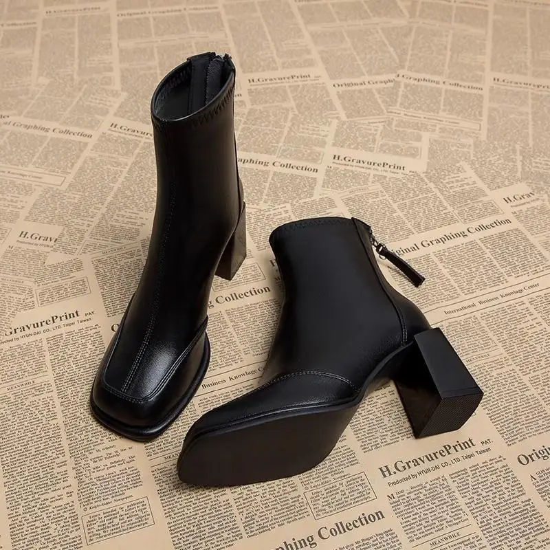 British Vintage Square Toe Ankle Boots Women 2025 Autumn Winter Thick High Heel Black Pu Boots Woman Cowboy Short Booties Shoes