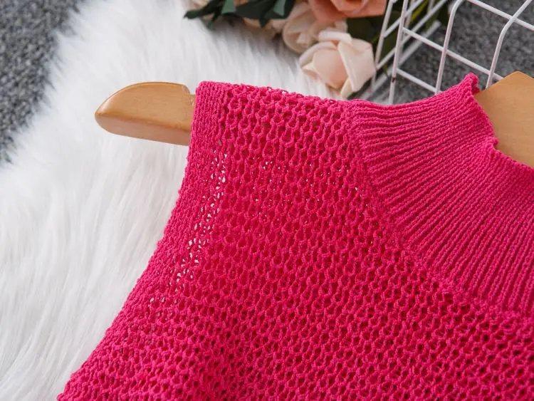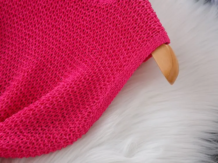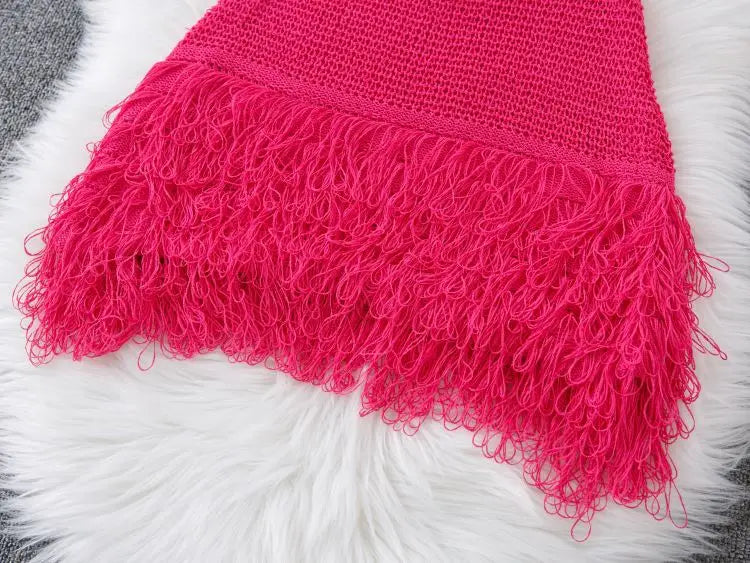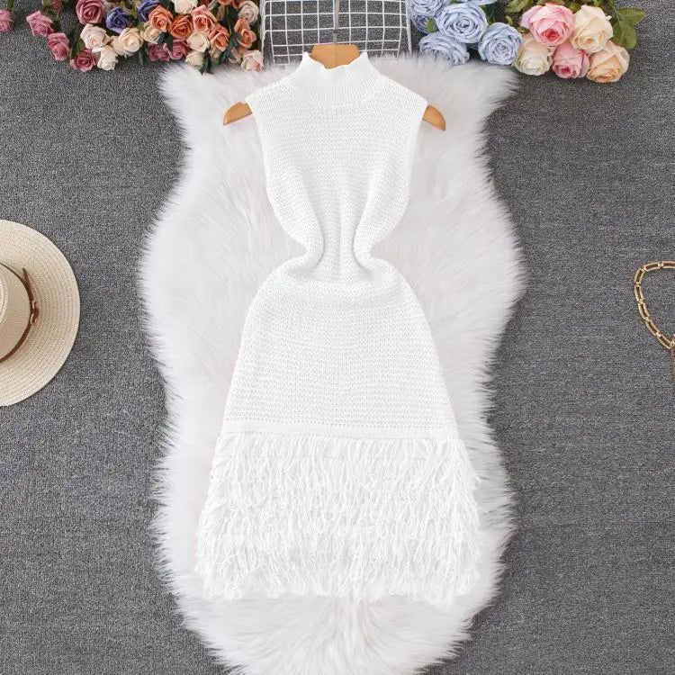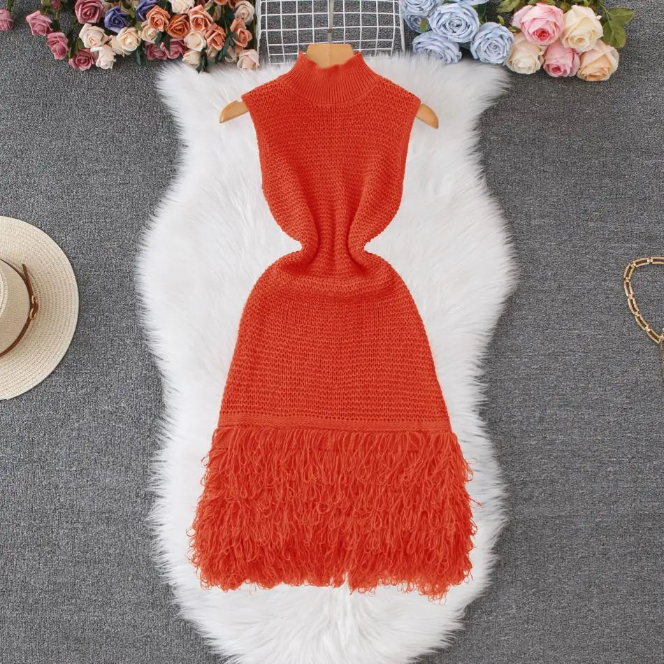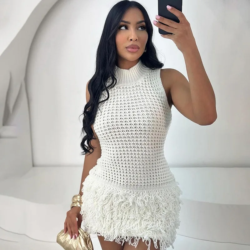 Vestido corto de punto con borlas, cuello redondo, sin mangas, con detalle calado de ganchillo y elástico, estilo ajustado, ideal para la playa o para usar a diario.