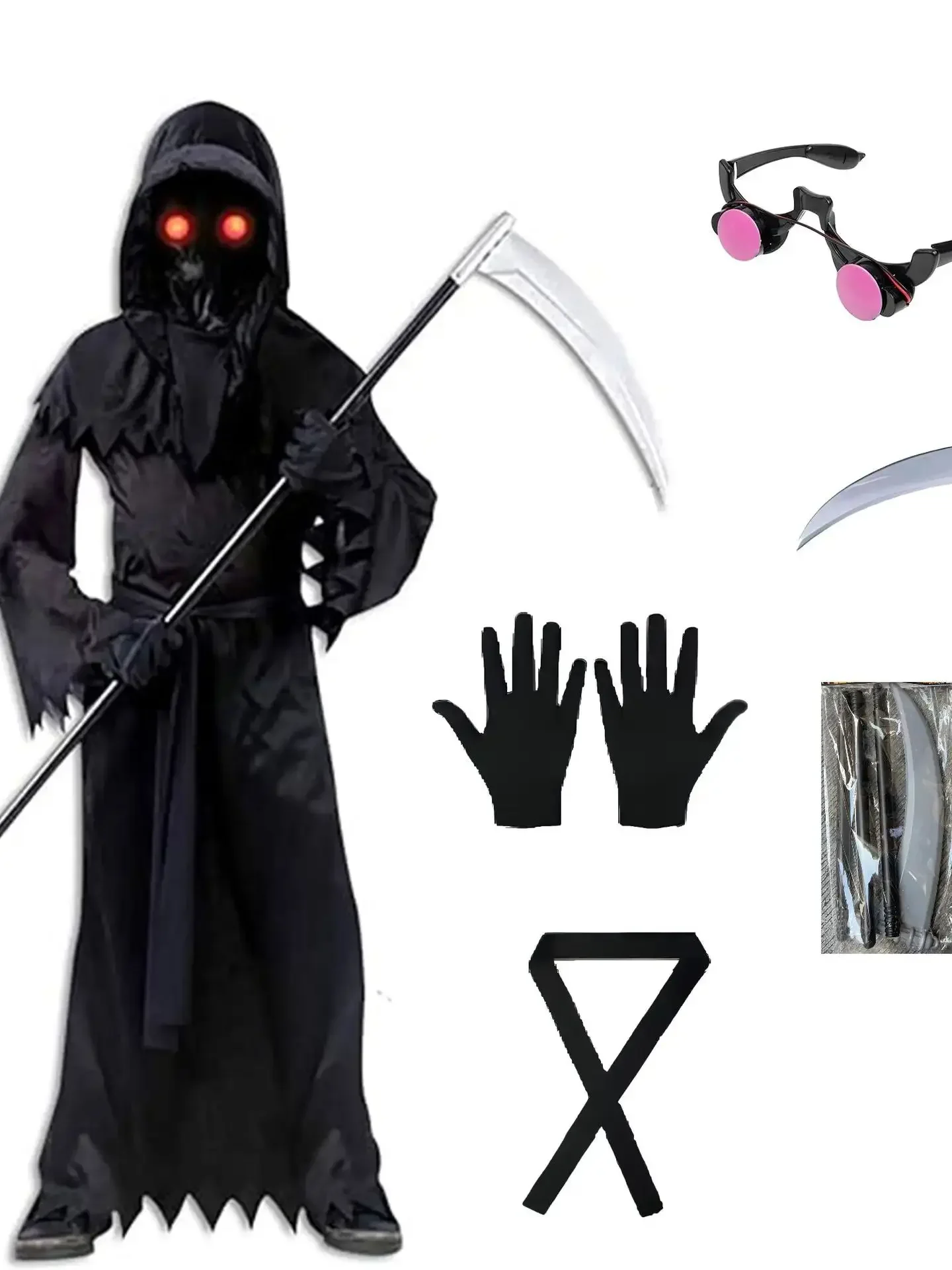 Child Horror Red Eye Grim Reaper Costume Scythe Devil Darkseid Ghost Cosplay Suit Halloween Hooded Party Dress Gloves