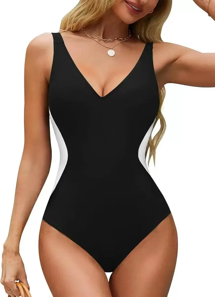 Traje de baño de una pieza de color contrastante para mujer, nuevo traje de baño de playa para mujer con escote en V profundo y tirantes finos, traje de baño de una pieza sexy.