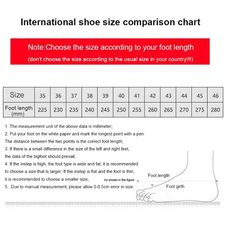 ¡Consulta nuestra tabla de tallas con atención! Te ayudará a elegir la talla correcta según la longitud de tu pie. Ten en cuenta que si tus pies son demasiado largos o anchos, elige una talla más de la habitual.
