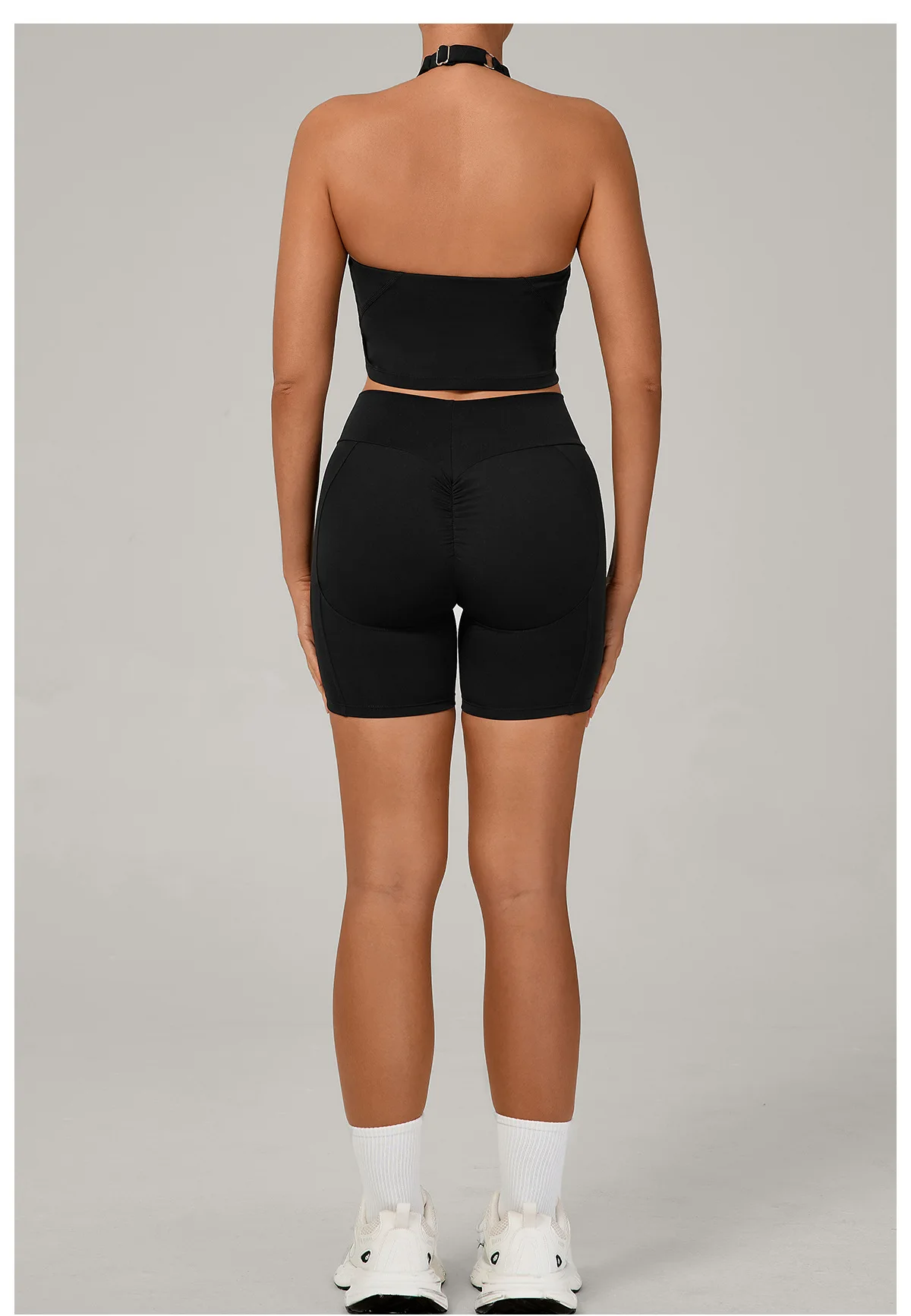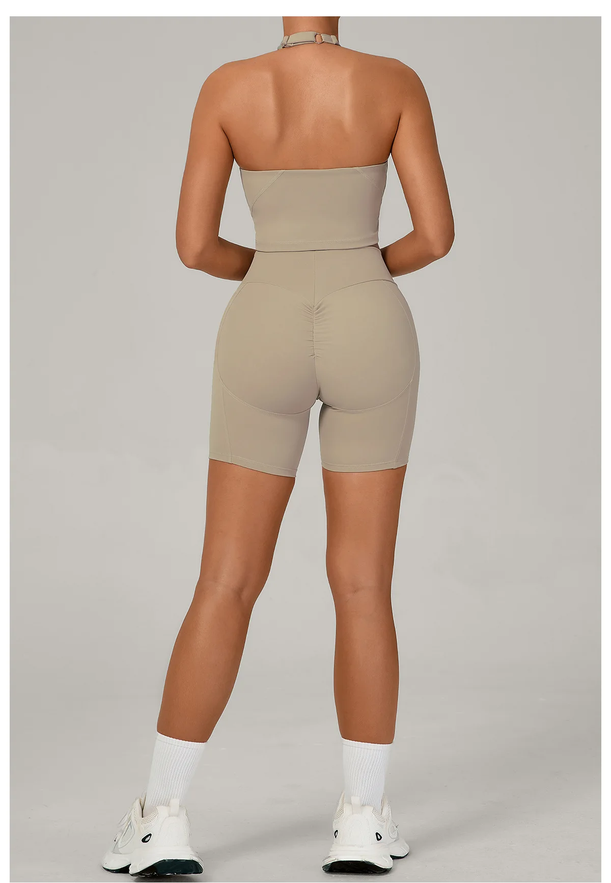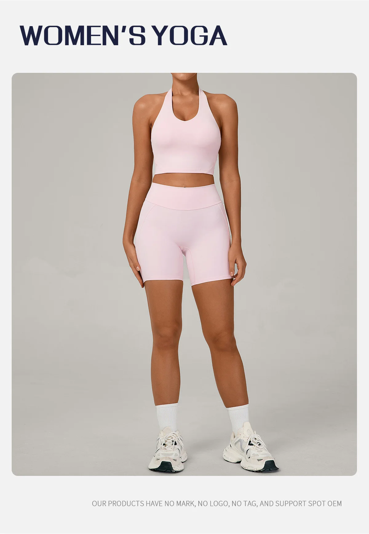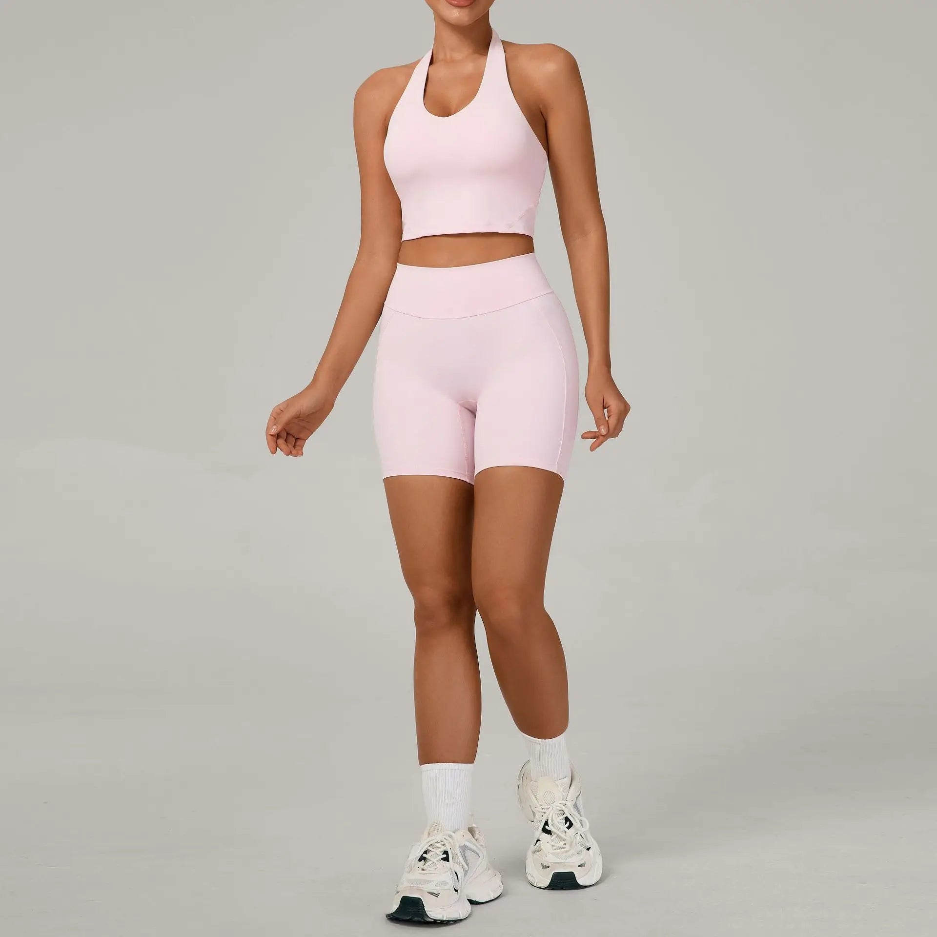 Ctenkevet - Conjunto de 2 piezas de sujetador halter sin espalda para mujer, ropa deportiva de secado rápido para gimnasio, conjunto deportivo femenino de dos piezas con pantalones cortos