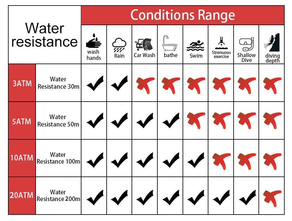 El reloj resistente al agua se divide en 3 categorías: resistente al agua para uso diario, resistente al agua para uso diario mejorado y resistente al agua para buceo.