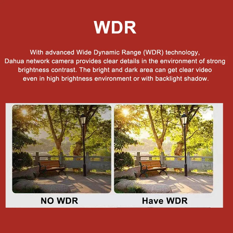 Gracias a su avanzada tecnología de amplio rango dinámico (WDR), la cámara de red Dahua ofrece detalles nítidos incluso en entornos con alto contraste de brillo. Las zonas claras y oscuras se visualizan con claridad incluso en ambientes muy luminosos o con sombras a contraluz.