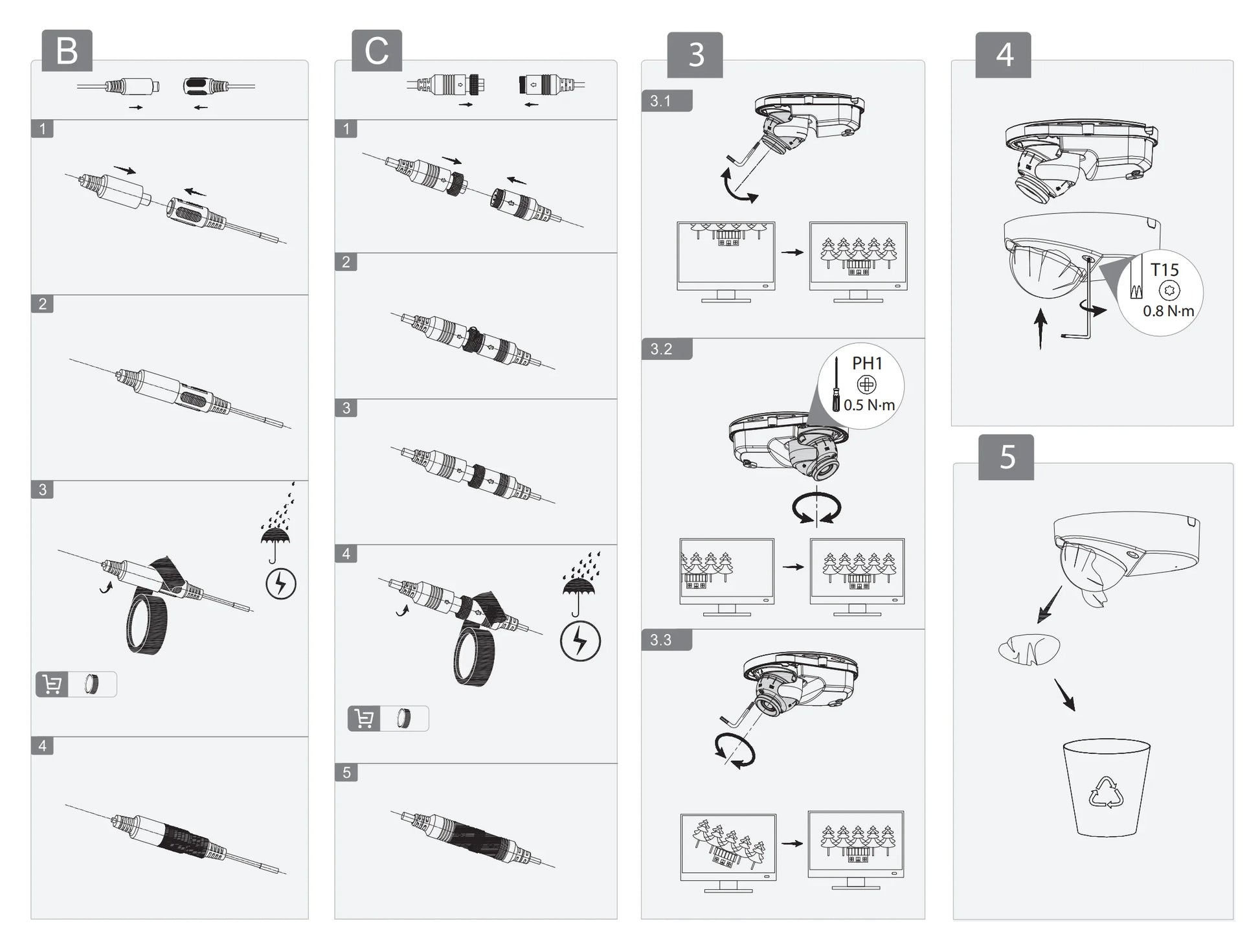 > Detección de anomalías: Detección de movimiento, manipulación de vídeo, detección de audio, falta de tarjeta SD, tarjeta SD llena, error de tarjeta SD, desconexión de red, conflicto de IP, acceso ilegal, detección de voltaje.