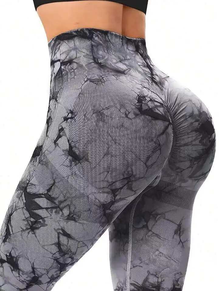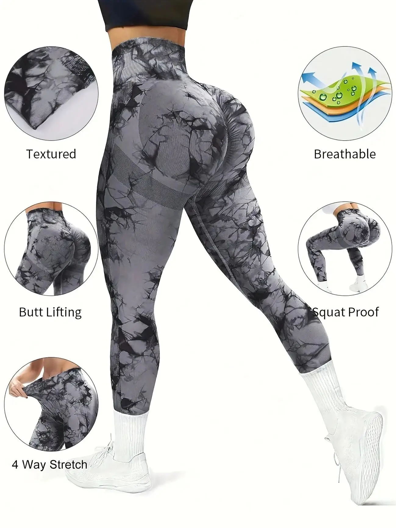 Pantalones de yoga de diseño, teñidos con la técnica tie-dye, cintura ancha, corte ajustado, sin costuras, efecto melocotón en la cadera, pantalones deportivos.