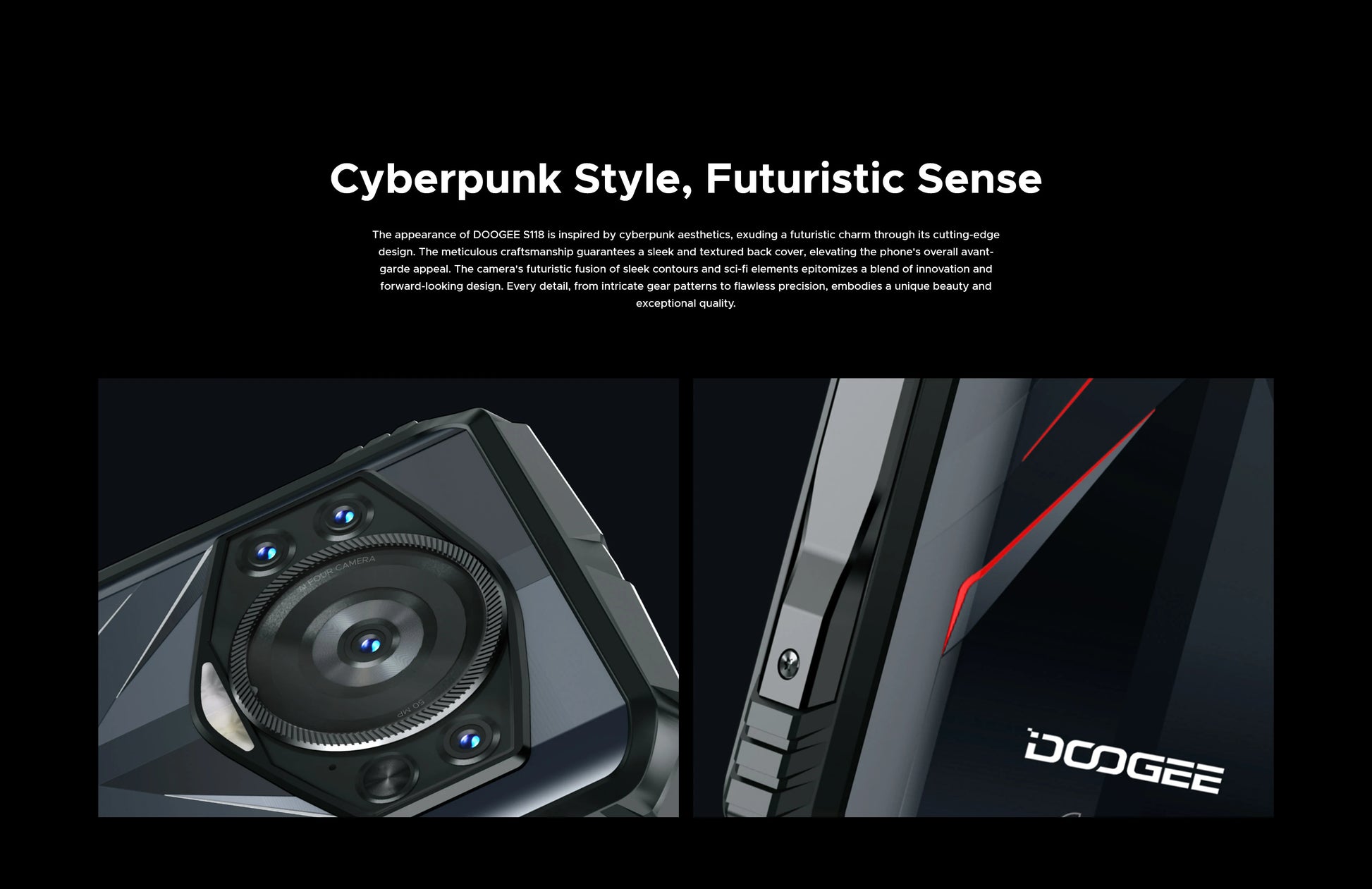El diseño del DOOGEE S118 se inspira en la estética cyberpunk, exudando un encanto futurista gracias a su vanguardista estética. Su meticulosa fabricación garantiza una elegante cubierta trasera texturizada, realzando el atractivo vanguardista del teléfono. La cámara, con su fusión futurista de contornos estilizados y elementos de ciencia ficción, personifica la innovación y el diseño de vanguardia. Cada detalle, desde los intrincados patrones de engranajes hasta la precisión impecable, encarna una belleza única y una calidad excepcional.