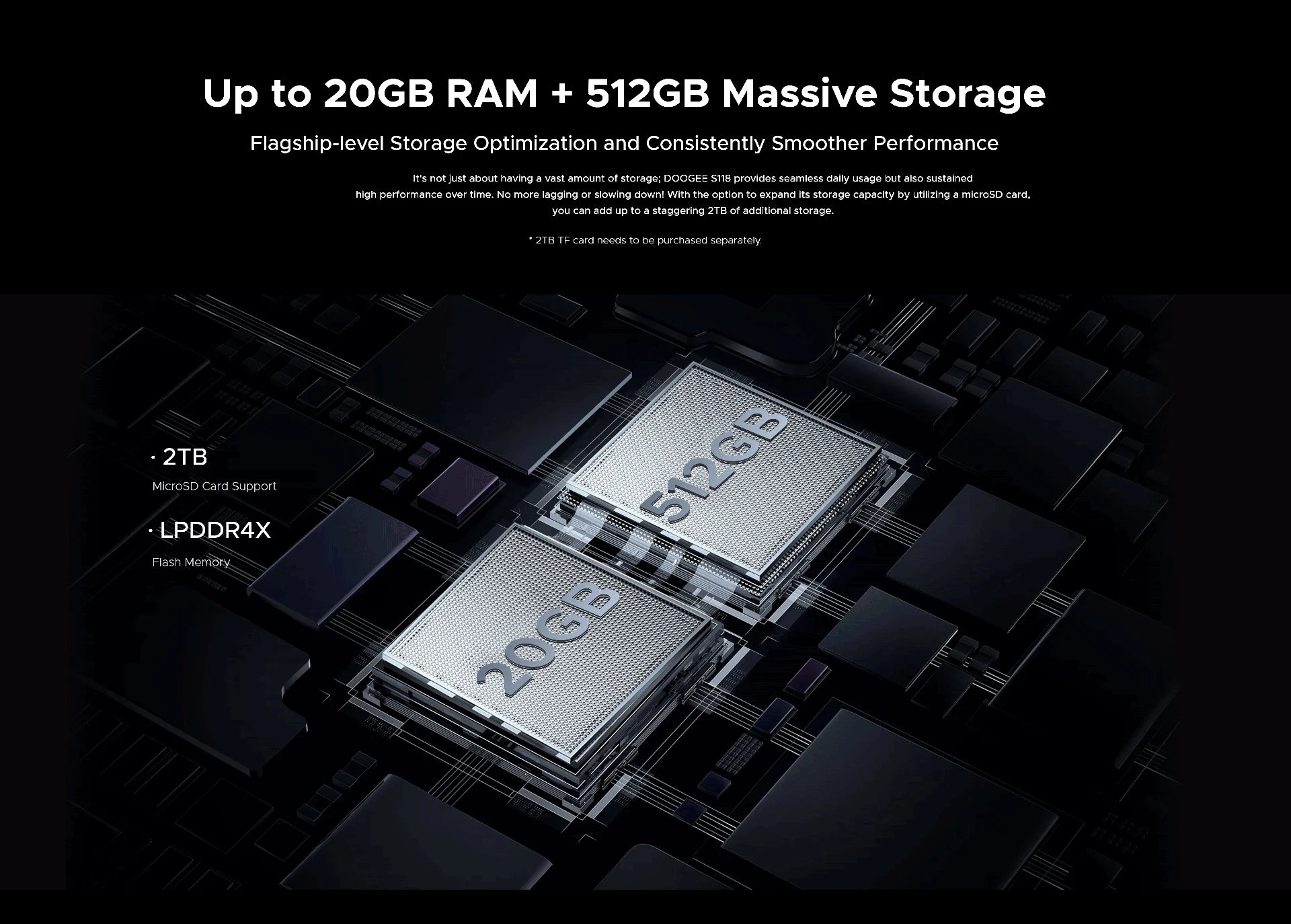El DOOGEE S118 ofrece una amplia memoria RAM de hasta 20 GB y 512 GB de ROM para que los usuarios puedan cambiar sin esfuerzo entre plataformas de redes sociales, clientes de correo electrónico, reproducción de vídeo y otras aplicaciones sin experimentar ralentizaciones.