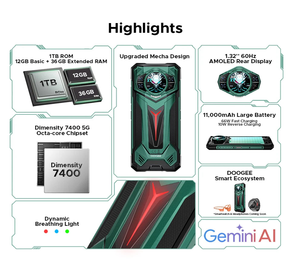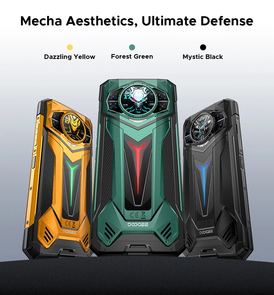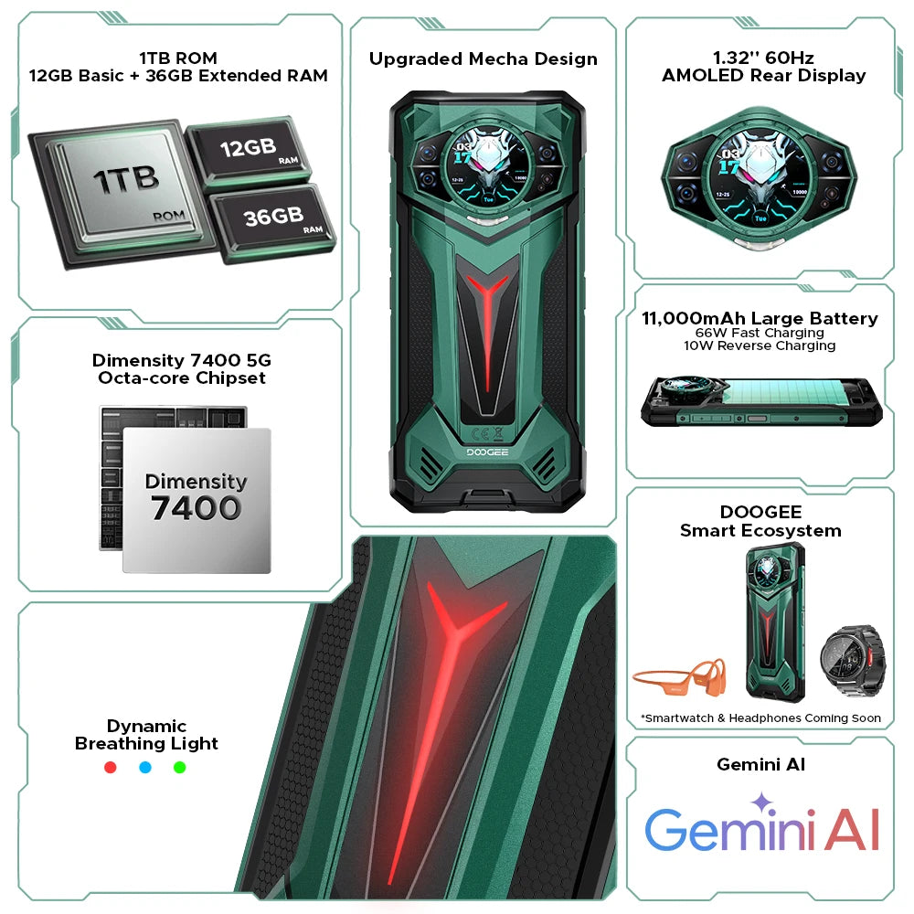 Teléfono resistente DOOGEE S200 Ultra 5G con IA, 48 GB + 1 TB, pantalla trasera de 1,34" con efecto de luz, procesador Dimensity 7400, batería de 11000 mAh, carga rápida de 66 W, NFC, WiFi 6E.