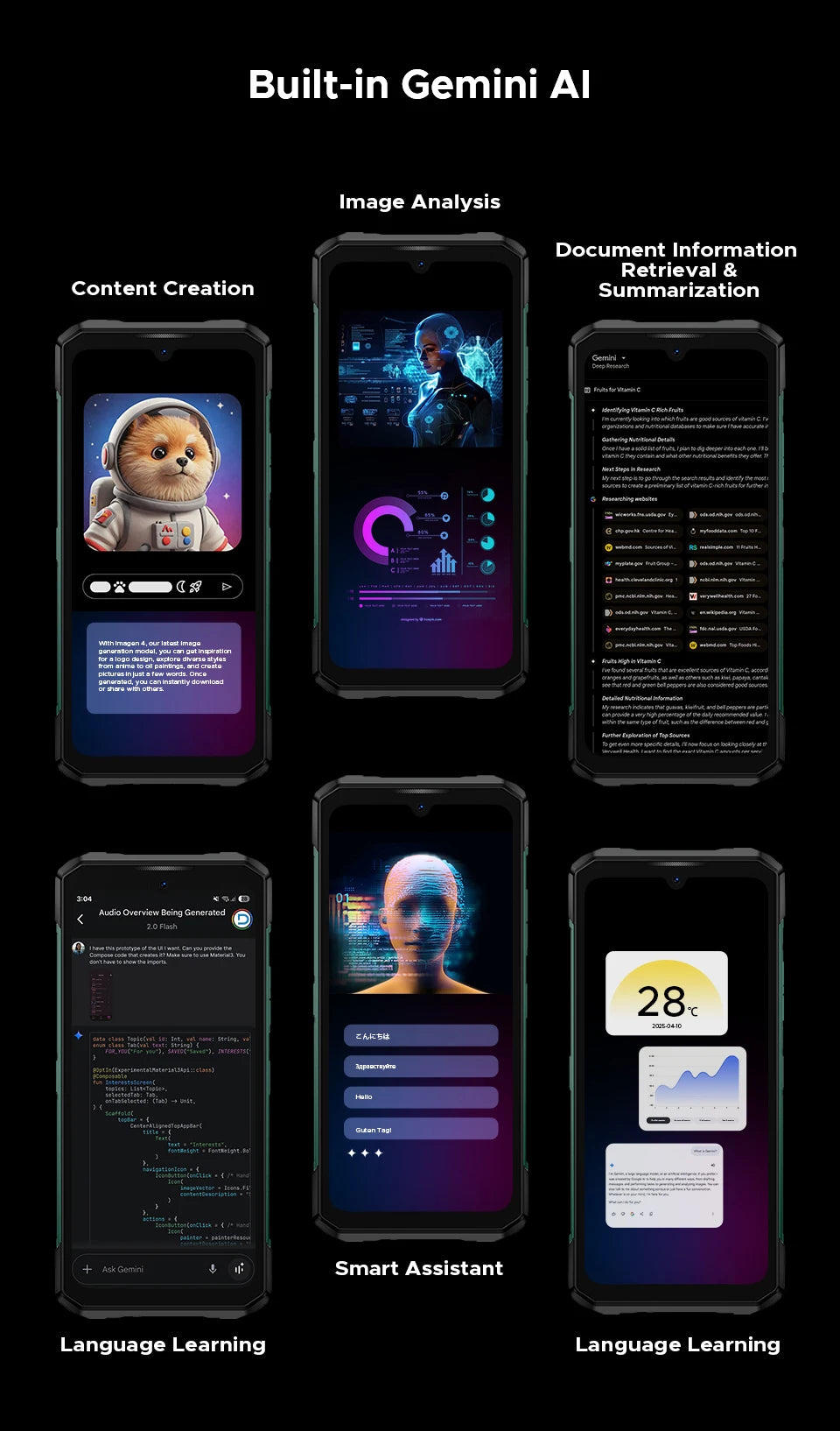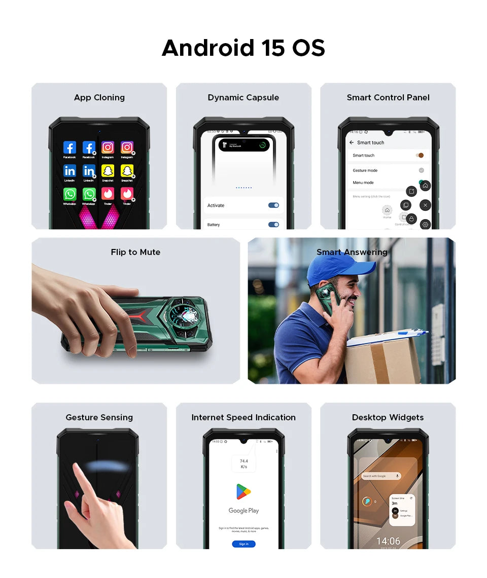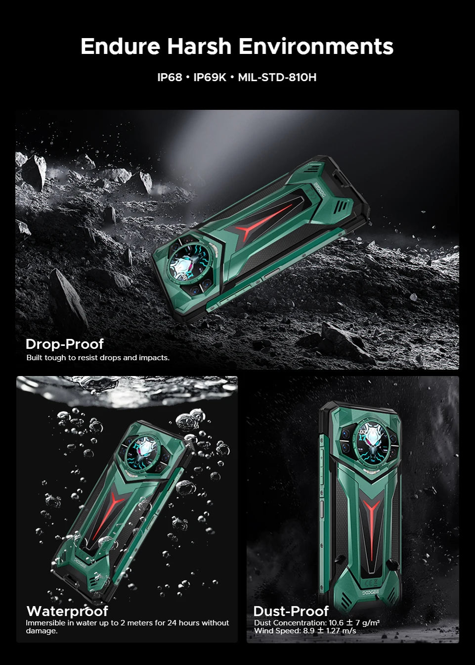 Teléfono resistente DOOGEE S200 Ultra 5G con IA, 48 GB + 1 TB, pantalla trasera de 1,34" con efecto de luz, procesador Dimensity 7400, batería de 11000 mAh, carga rápida de 66 W, NFC, WiFi 6E.