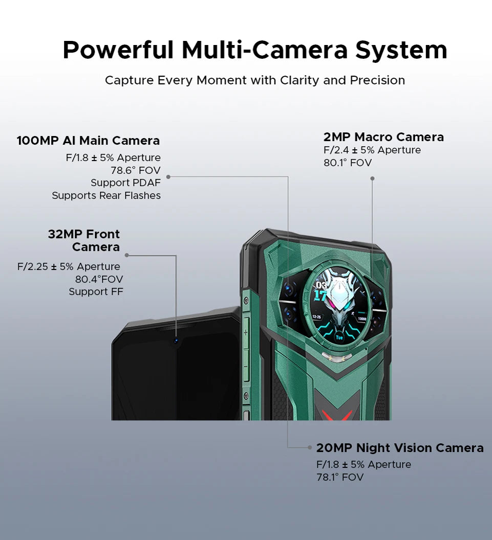 Cámara principal con IA de 100 MP + cámara de visión nocturna de 20 MP + cámara macro de 2 MP