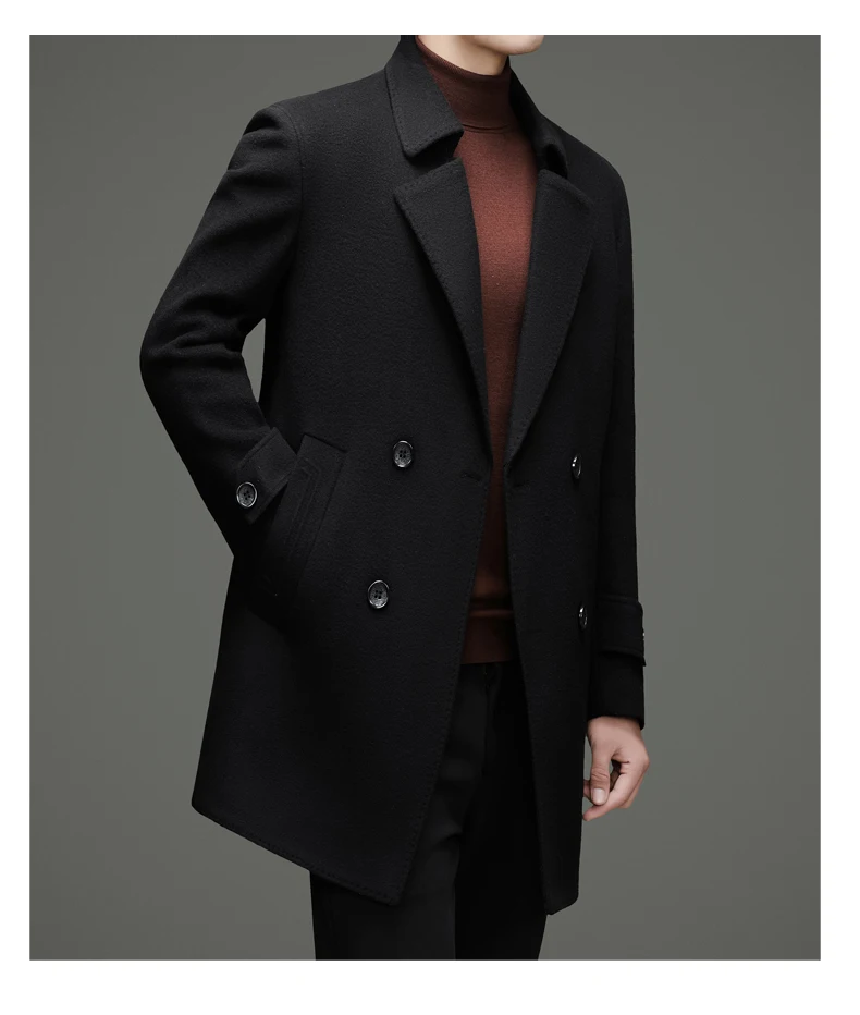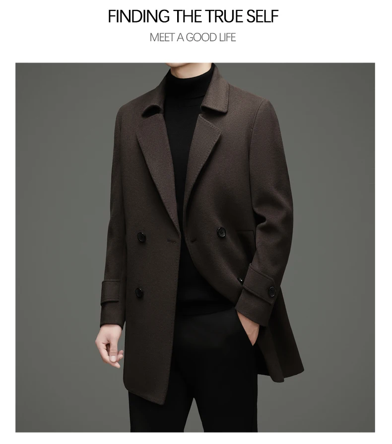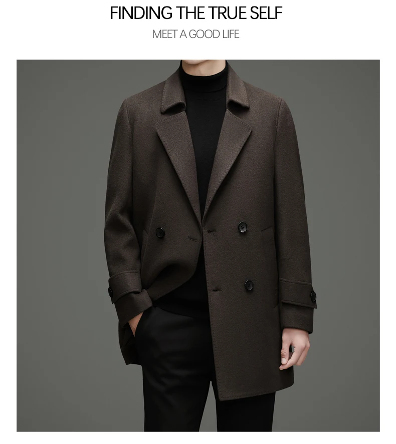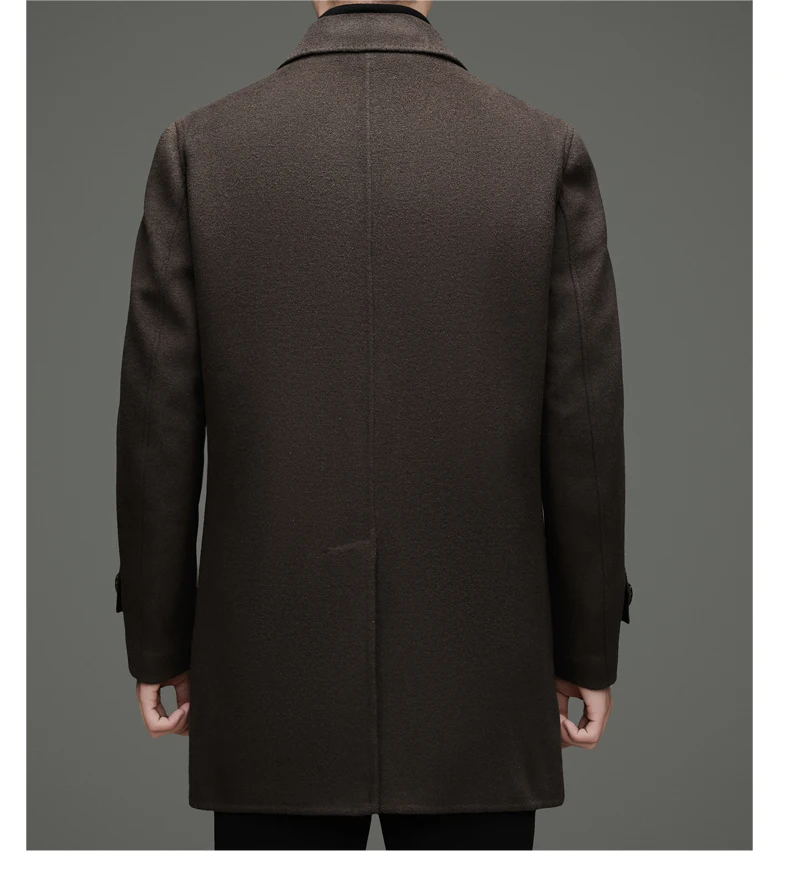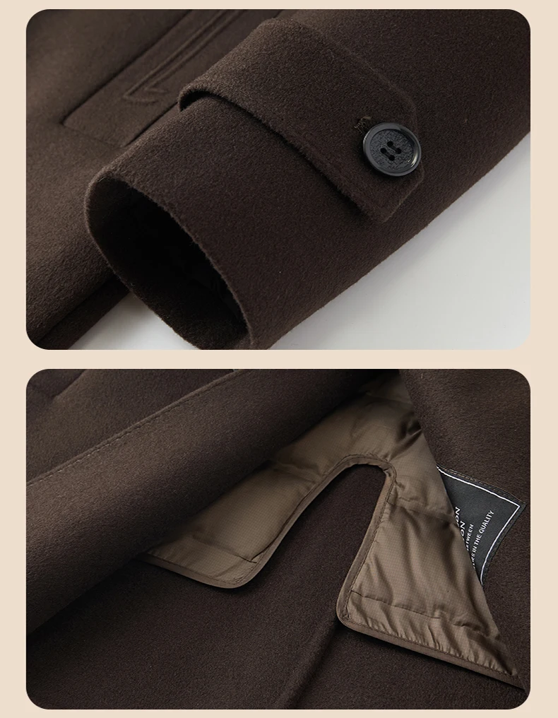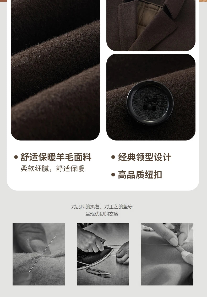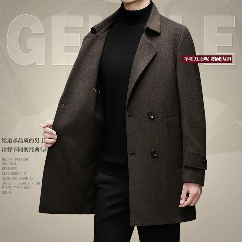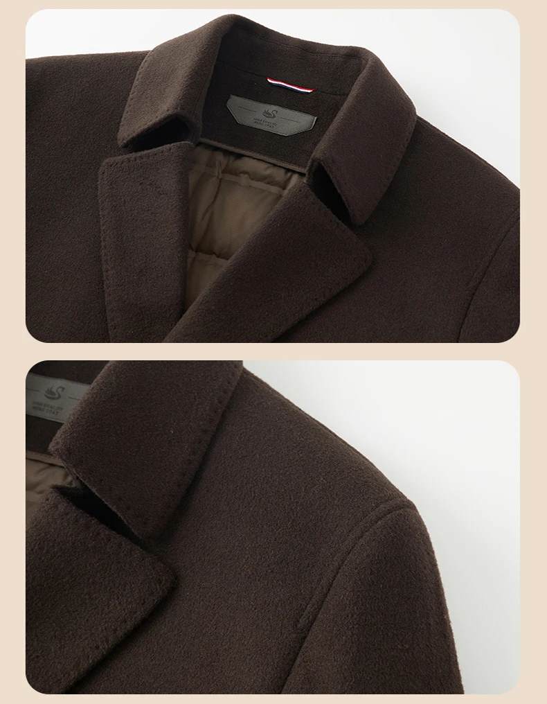 Abrigo de lana de doble faz para hombre, suave y cálido, ideal como prenda esencial. Incluye chaleco de plumas y forro. Color negro café. Estilo clásico.