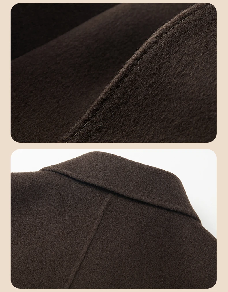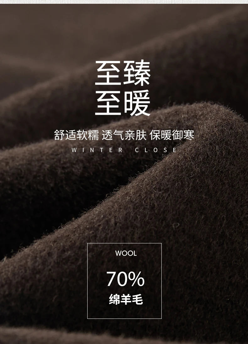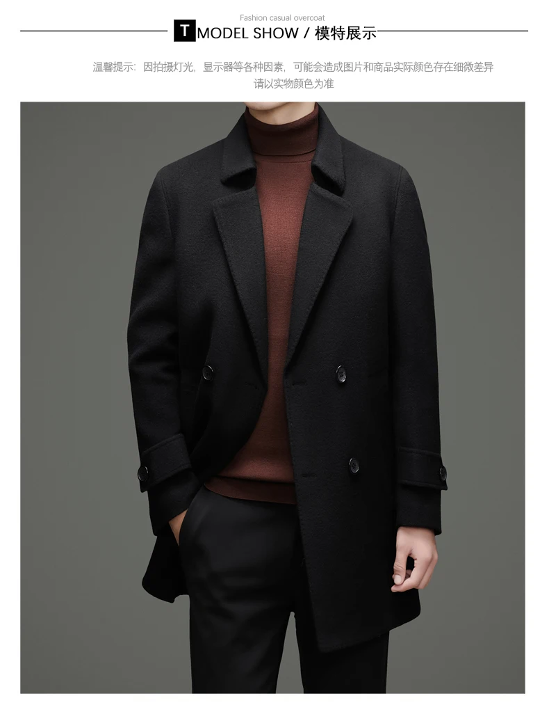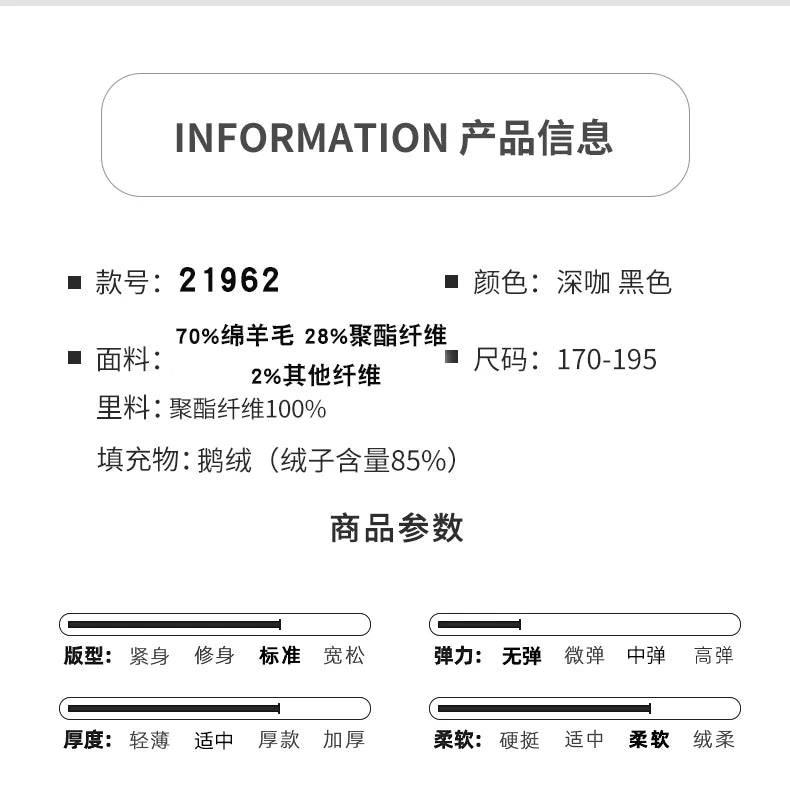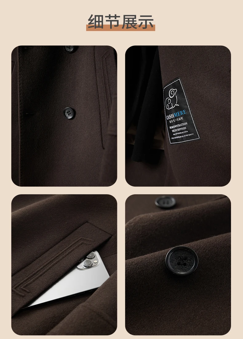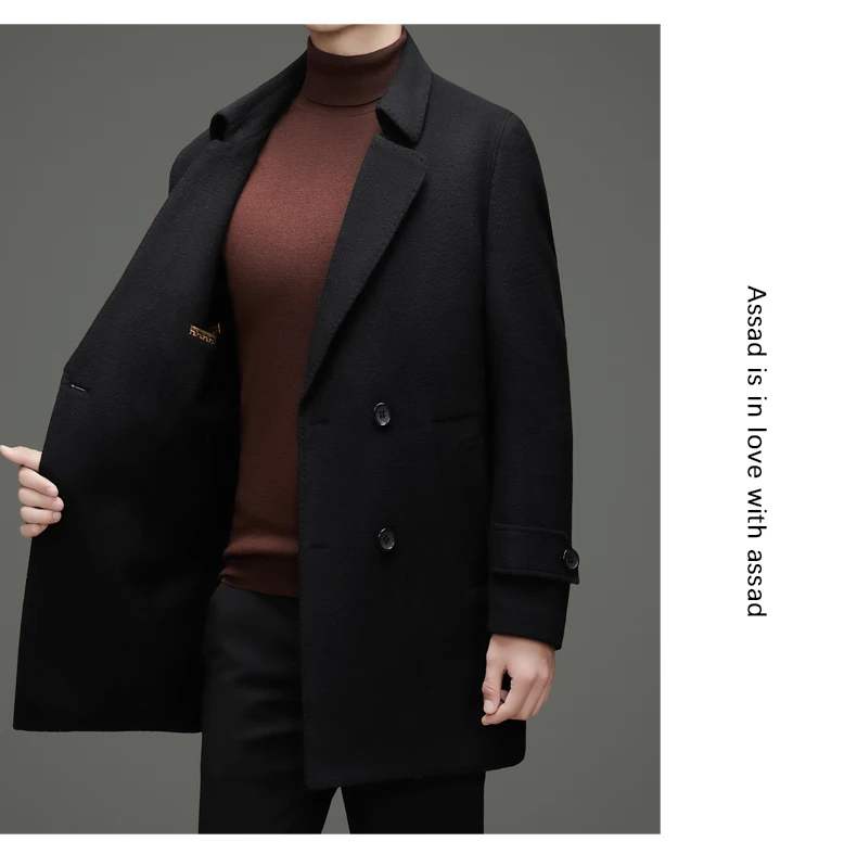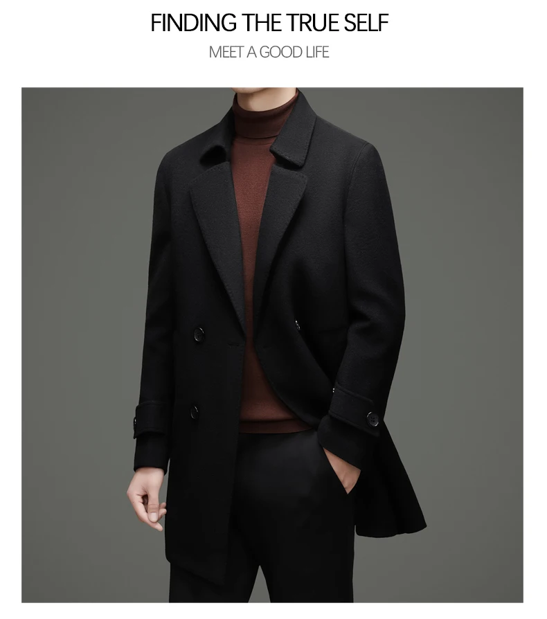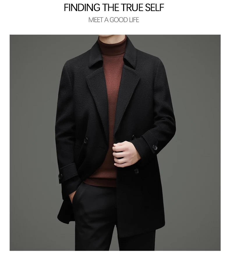 Abrigo de lana de doble faz para hombre, suave y cálido, ideal como prenda esencial. Incluye chaleco de plumas y forro. Color negro café. Estilo clásico.