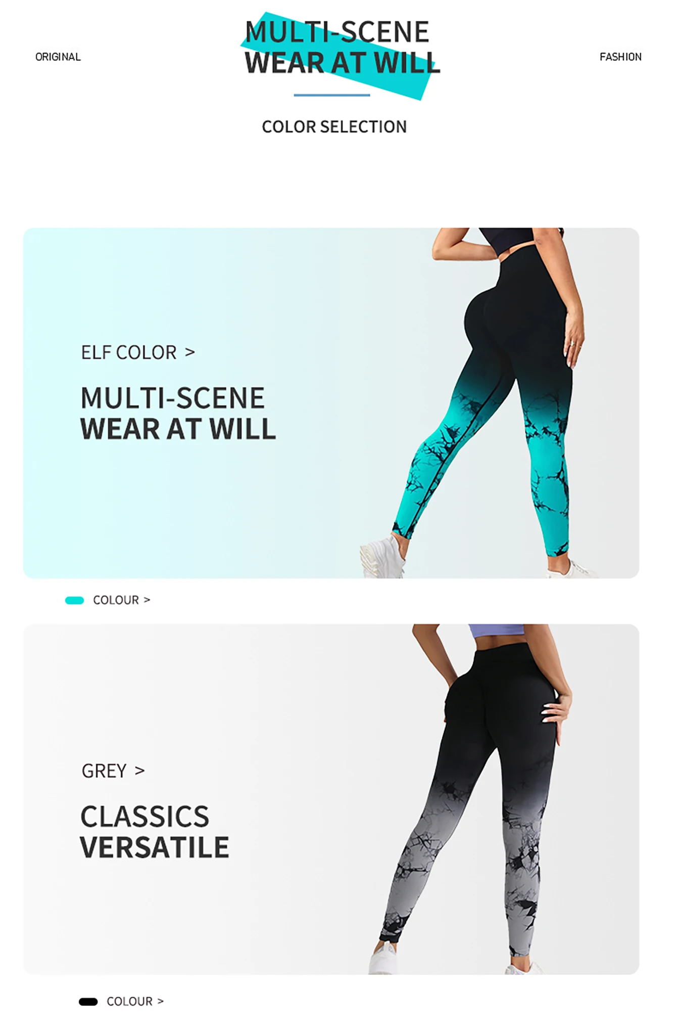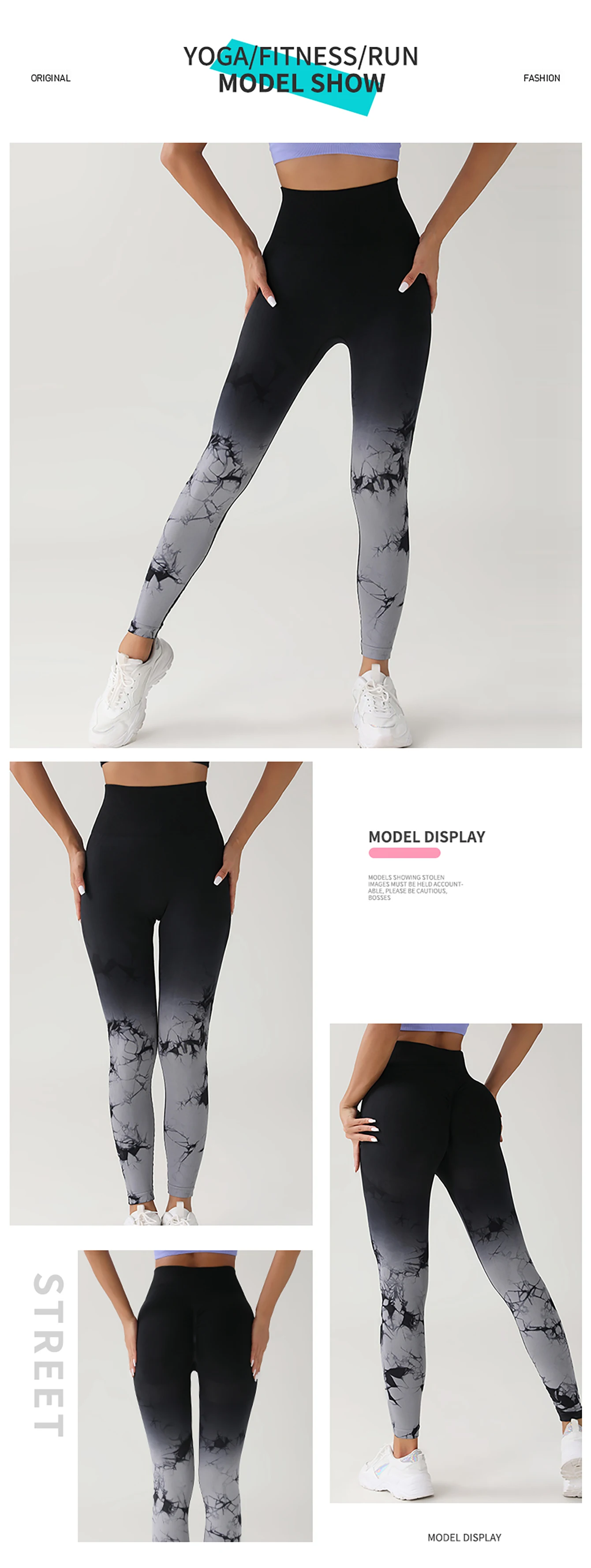 Pantalones de yoga con efecto tie-dye degradado, sin costuras, para mujer, para correr y hacer deporte, cintura alta y levantamiento de cadera, ropa de fitness elástica ajustada.