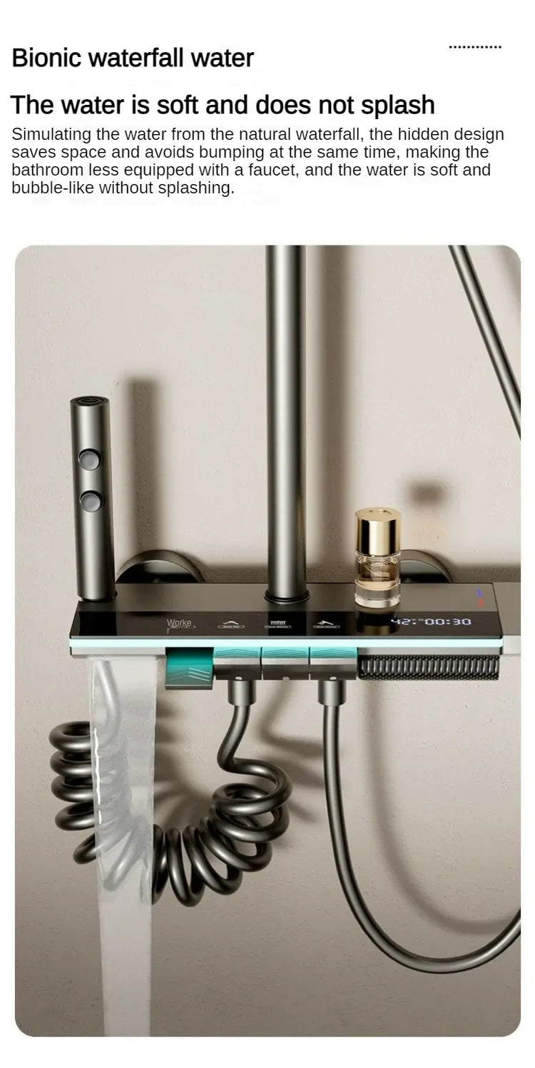 Juego de ducha gris con sistema de ducha inteligente de cuatro funciones con pantalla digital, ducha tipo lluvia a presión, grifería de pared con teclas de piano
