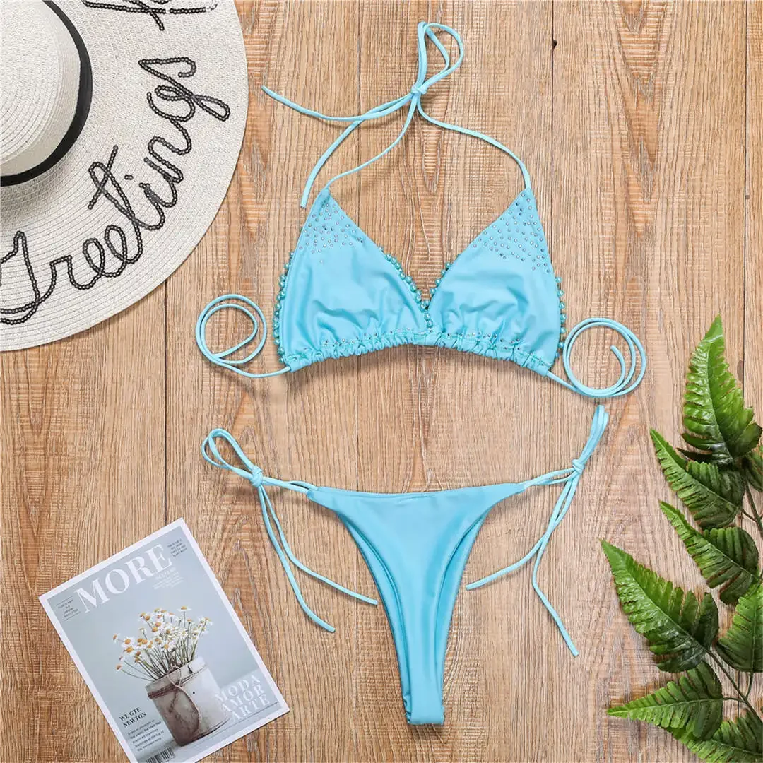 Bikini de lujo con perlas y escote halter, mini bikinis, micro bikinis, traje de baño femenino, conjunto de bikini de dos piezas, traje de baño para mujer