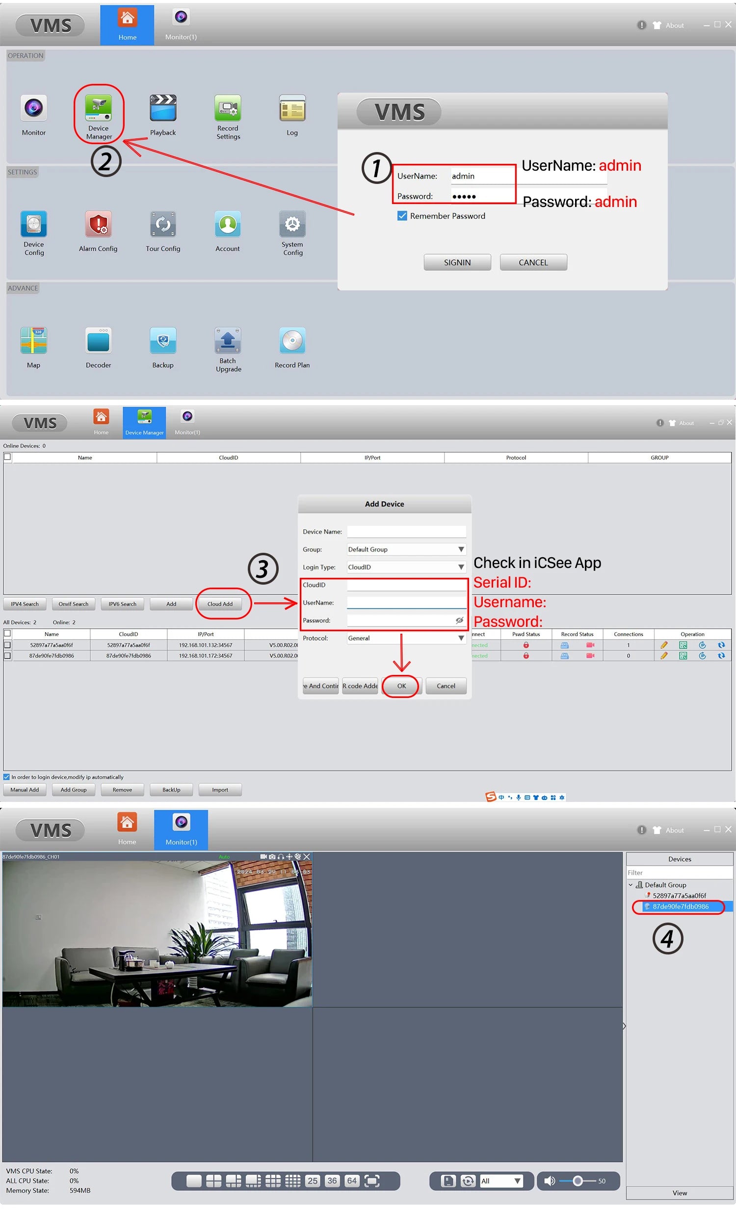 2. Busque el número de serie completo, la contraseña y el nombre de usuario en la aplicación icsee, introdúzcalos en el software VMS y añádalo correctamente.