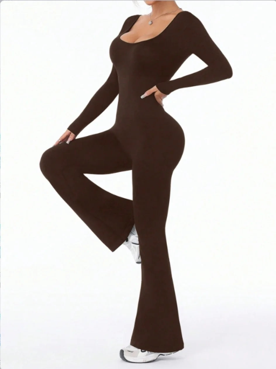 Mono deportivo de compresión de manga larga de color sólido de alta calidad para mujer, pantalones acampanados, conjunto de yoga sexy con efecto push up