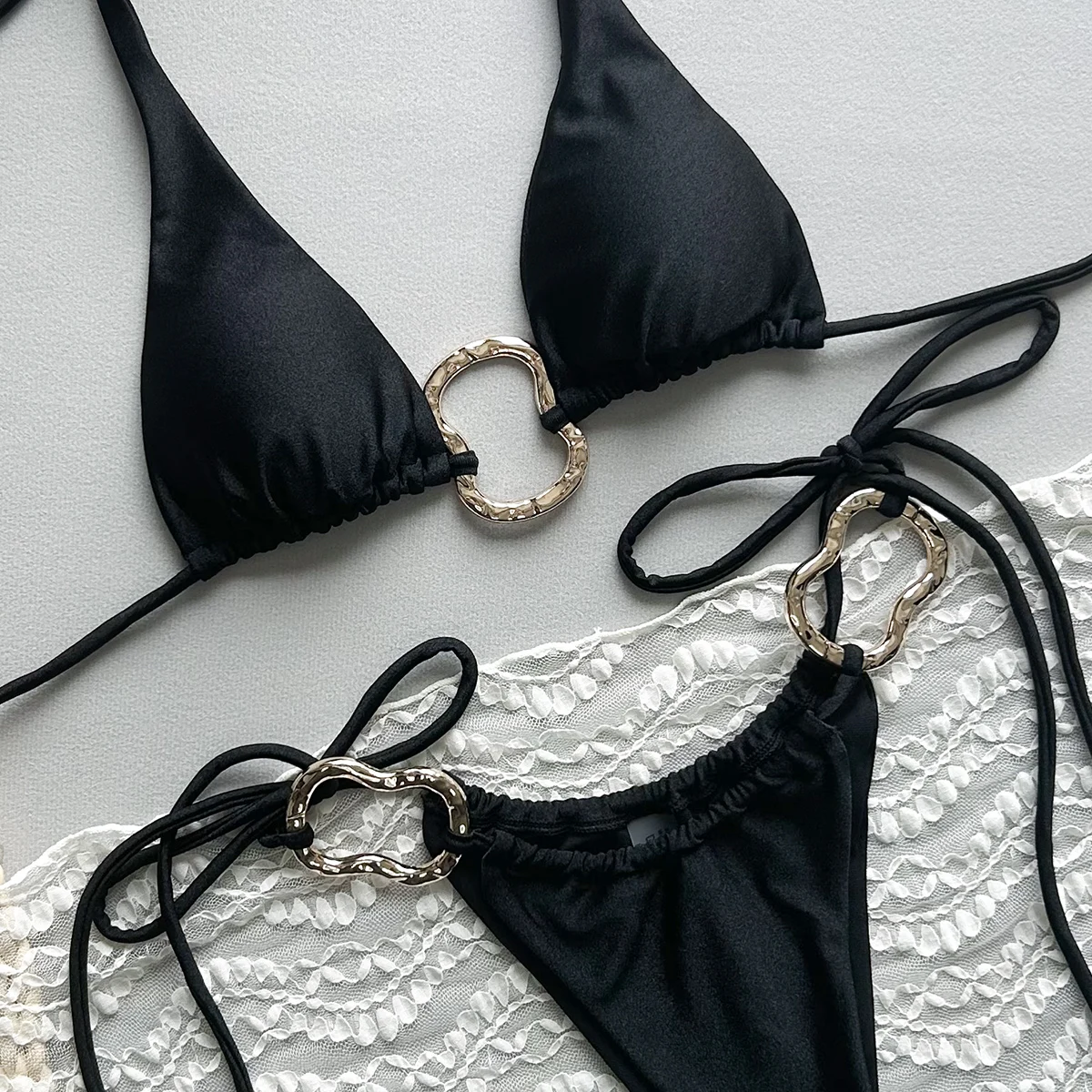 Conjunto de bikini de talle alto para mujer, sexy, con cuello halter, tanga ajustable, traje de baño de color liso con anillo dorado para playa, piscina y fiesta.