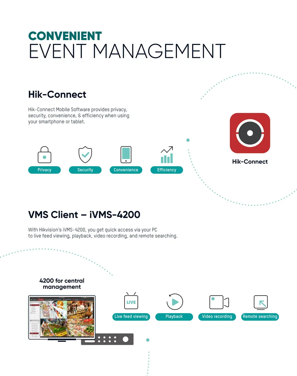 Además, la aplicación HikConnect facilita la visualización de cámaras en directo, lo que le permite vigilar las zonas públicas alrededor de su propiedad para una mayor seguridad.