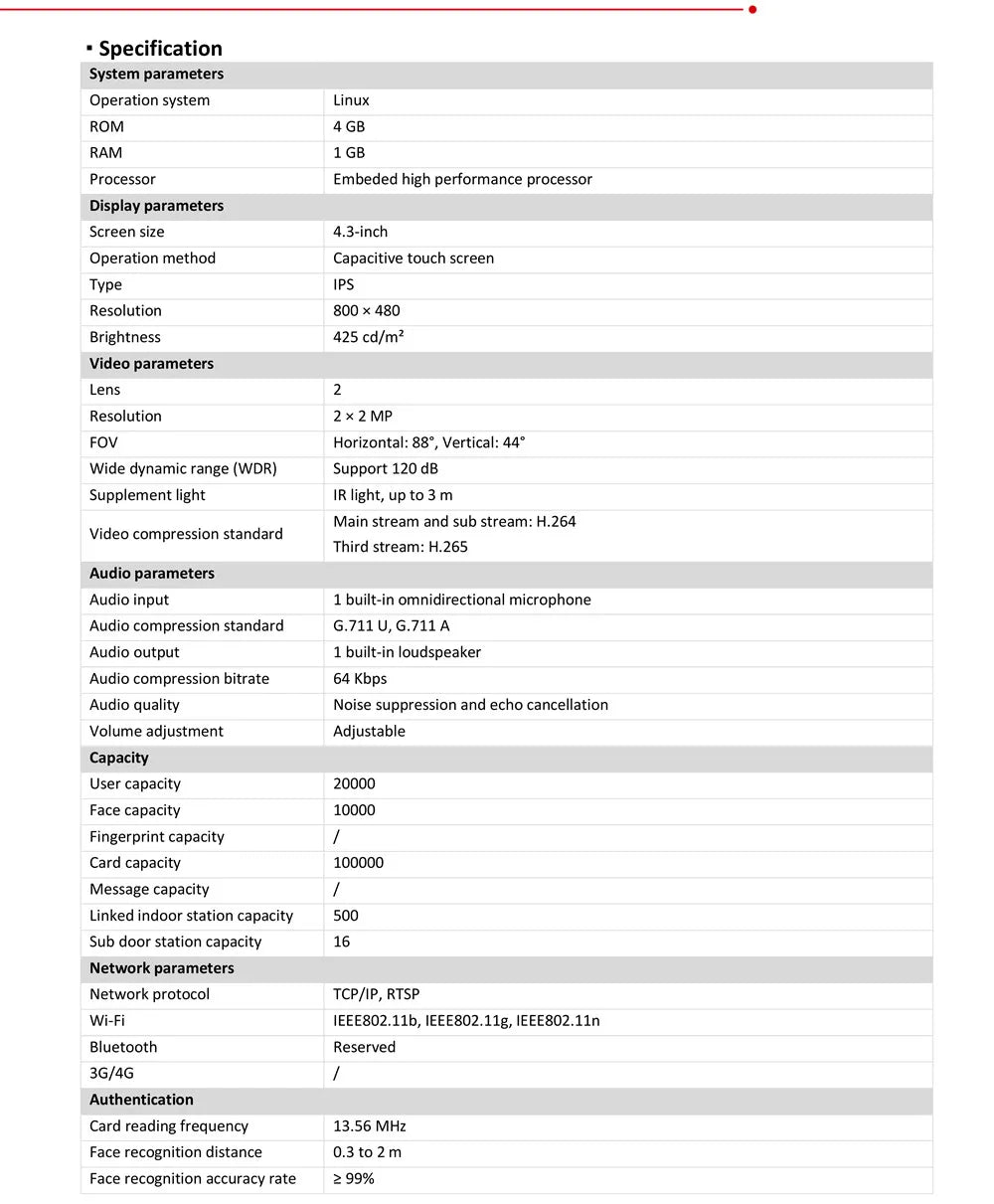Las cámaras duales de 2 MP cuentan con lentes que proporcionan un campo de visión horizontal de 88°, mientras que una pantalla táctil LCD capacitiva de 4,3" mejora la usabilidad y los modos de autenticación.