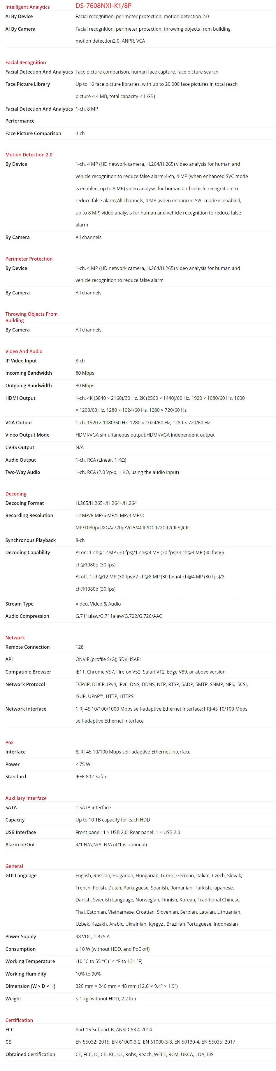 DS-7608NXI-K1/8P: NVR AcuSense 4K de 8 canales, 8 PoE y 1U de la serie K