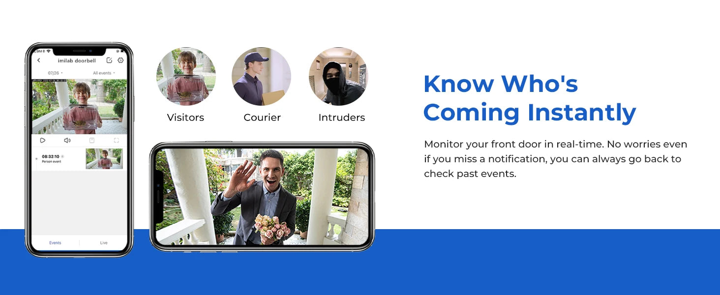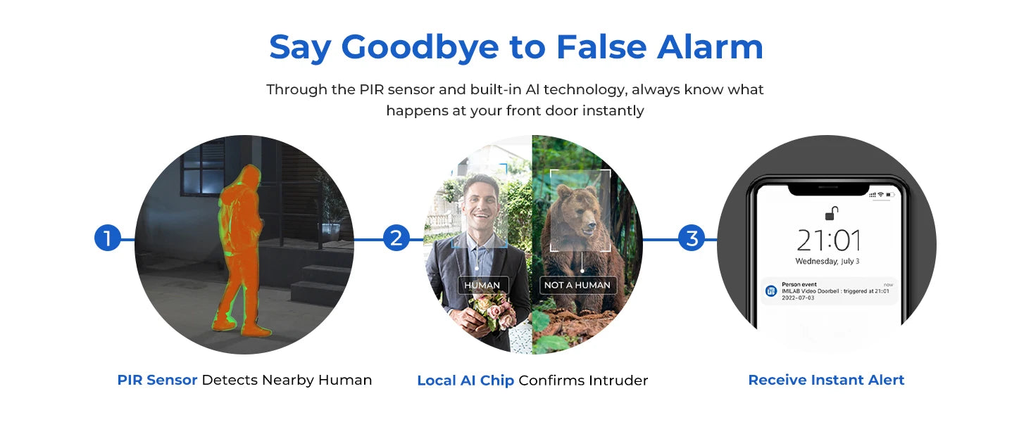 With built-in highly accurate Passive Infrared (PIR) and AI human detection technology, IMILAB Video Doorbell can precisely detect to identify humans from other objects and only send you an instant alert as soon as someone approaches your front door. That helps to reduce false alerts caused by vehicles, animals, small insects or plants.