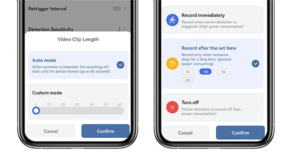 Set the video record time and the trigger time of appearing in the detection zone (5s or 10s) before sending an alert. Avoid false trigger alerts, saving overall power consumption and increasing battery life. Optimize the storage space.
