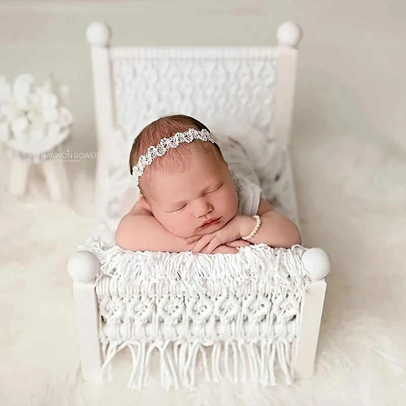 Cama de madera tejida blanca desmontada, estilo bohemio rústico europeo, accesorio de fotografía, decoración del hogar, sesiones de fotos