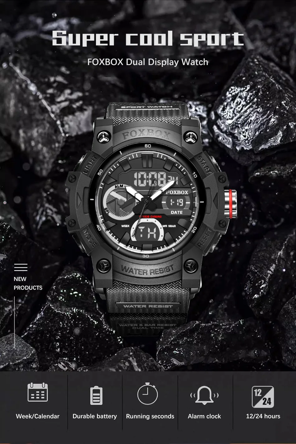 Características : Cronómetro, Luz de fondo, Resistente a golpes, Pantalla LED, Repetidor, Luminoso, Fecha automática, Cronógrafo, Calendario completo, Múltiples zonas horarias, Resistente al agua, Alarma, Natación, Visualización semanal, Manecillas luminosas