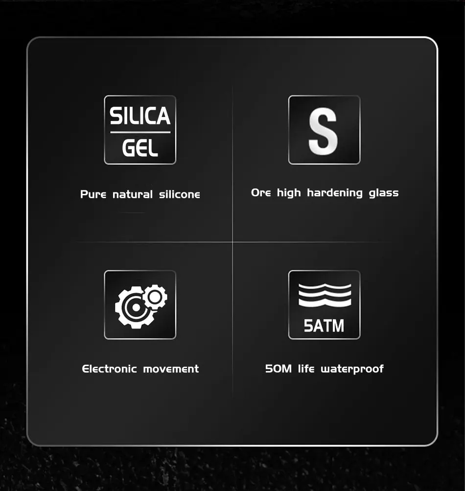 Características : Cronómetro, Resistente a golpes, Pantalla LED, Luminoso, Fecha automática, Cronógrafo, Calendario completo, Calendario perpetuo, Resistente al agua, Alarma, Natación, Visualización semanal, Agujas luminosas