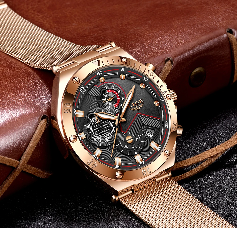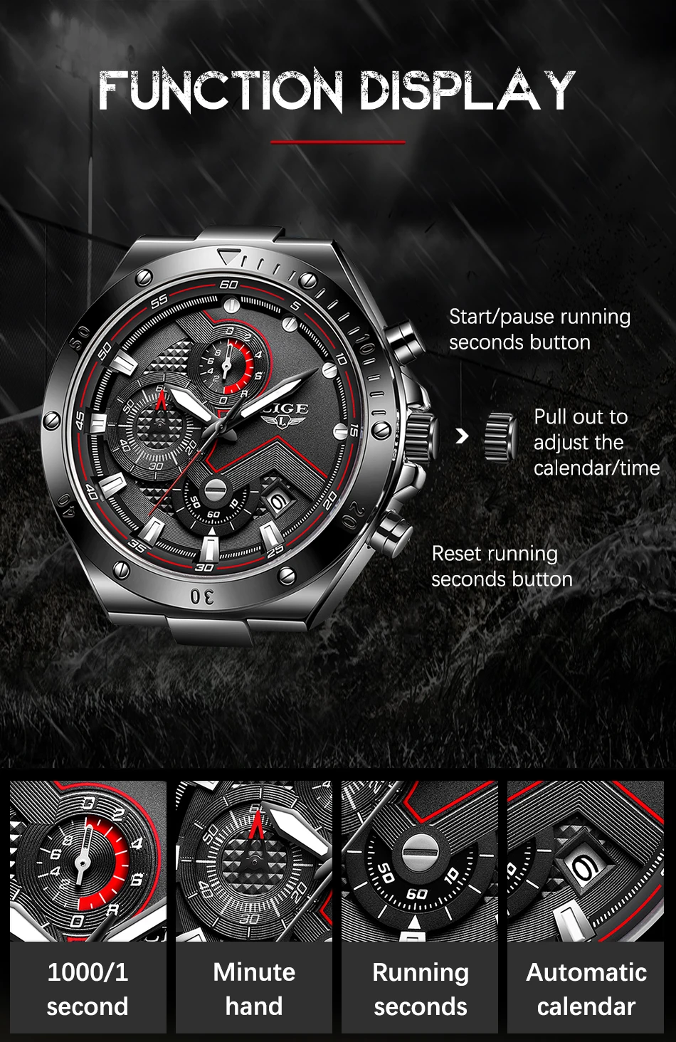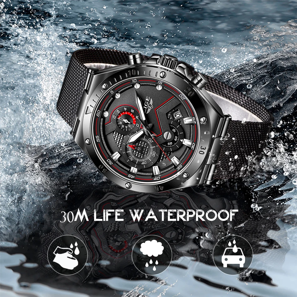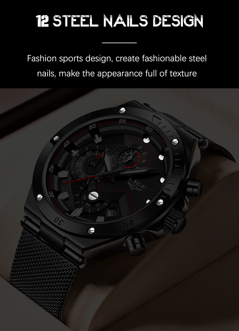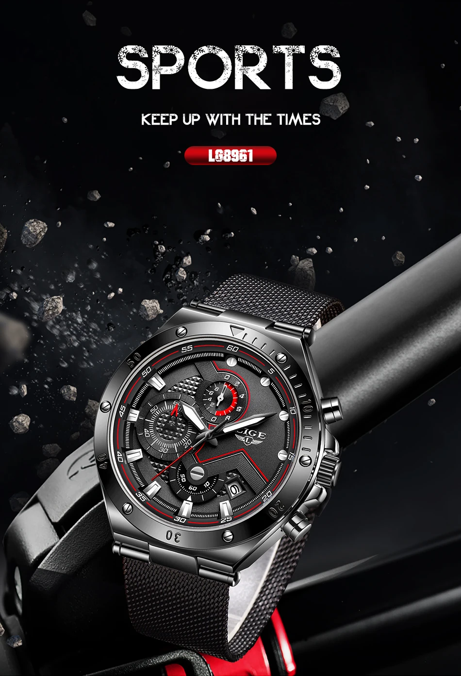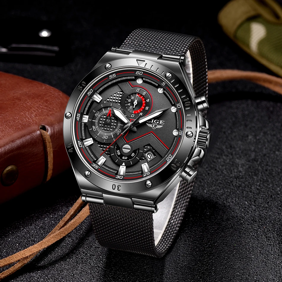 LIGE - Reloj de cuarzo de lujo para hombre, marca superior, moderno, de negocios, con correa de malla, resistente al agua, luminoso, cronógrafo