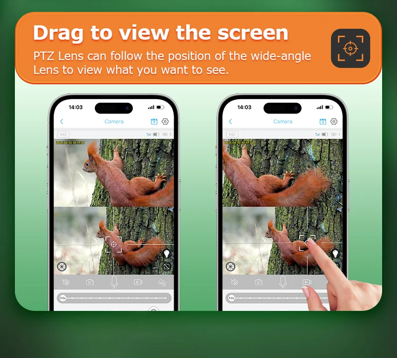 Función innovadora de enlace de lentes: Simplemente arrastre o haga clic en el área de interés en la imagen gran angular, y el objetivo zoom girará automáticamente y hará zoom en esa ubicación, logrando un monitoreo preciso de "donde apuntas, ves".